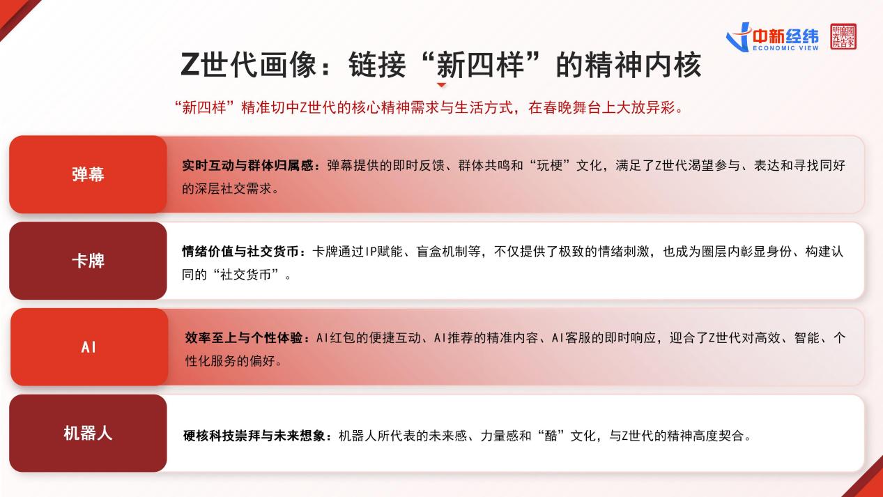 《报告》认为,马年央视春晚舞台“新四样”的登场,并非简单的品牌替换,而是对晚会内容形态与互动模式的根本性重塑。而链接“新四样”的精神内核,则在于精准切中Z世代的核心精神需求与生活方式。