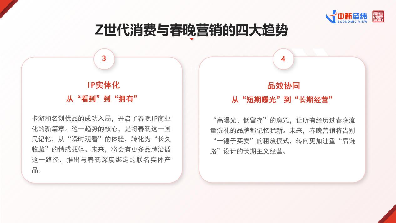 展望未来,《报告》认为,Z世代消费与春晚营销将呈现四大趋势。第一,AI深度融合,从“互动工具”到“内容共创”。第二,年轻化叙事,从“吸引”到“融入”。第三,IP实体化,从“看到”到“拥有”。第四,品效协同,从“短期曝光”到“长期经营”。