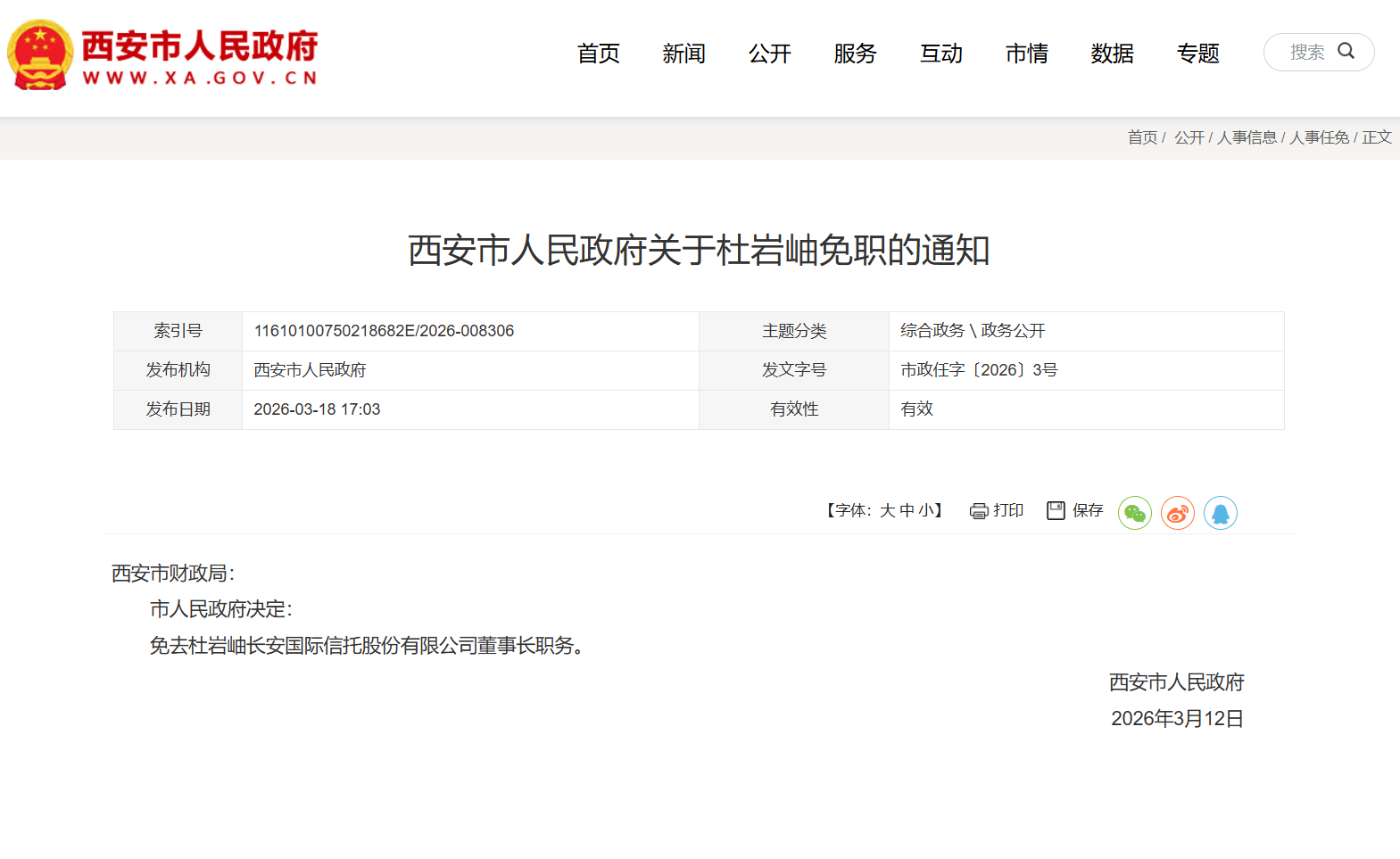 2024年10月,西安市发布《西安最新人事任免》,长安信托董事长杜岩岫任西安市人民政府国有资产监督管理委员会党委副书记。
