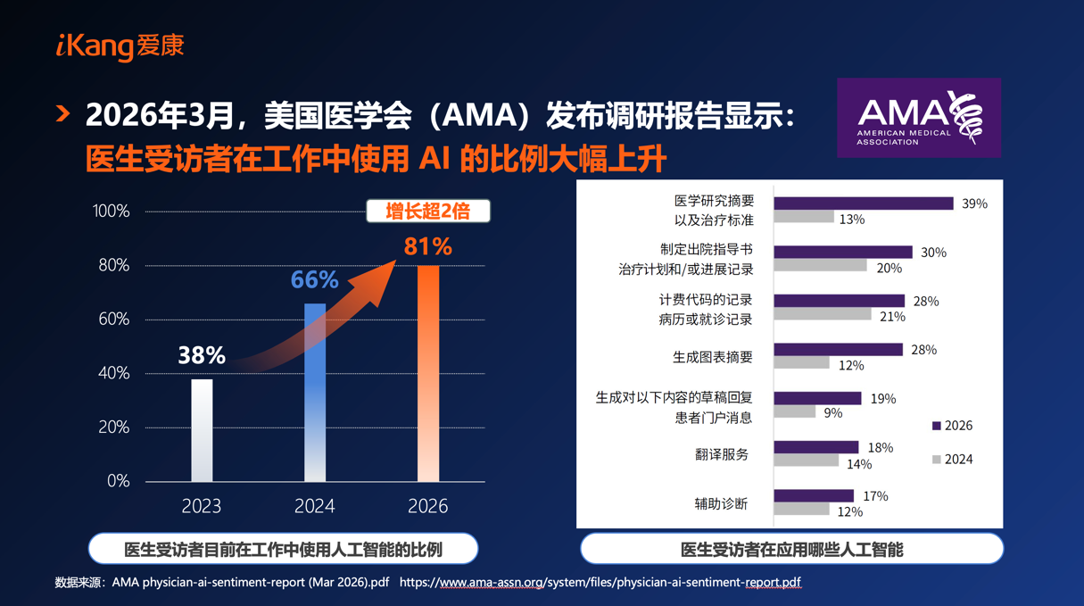在医疗领域,AI能够复制专家经验,有效弥补优质医疗资源供需失衡的现状,在疾病诊断、风险筛查等领域具备巨大应用潜力。美国医学会在2026年3月发布的最新调研数据也印证了这一趋势:2023年仅1/3美国医生使用AI,2024年升至2/3,如今这一比例已达81%,AI已逐步成为全球医生日常工作的重要辅助工具。