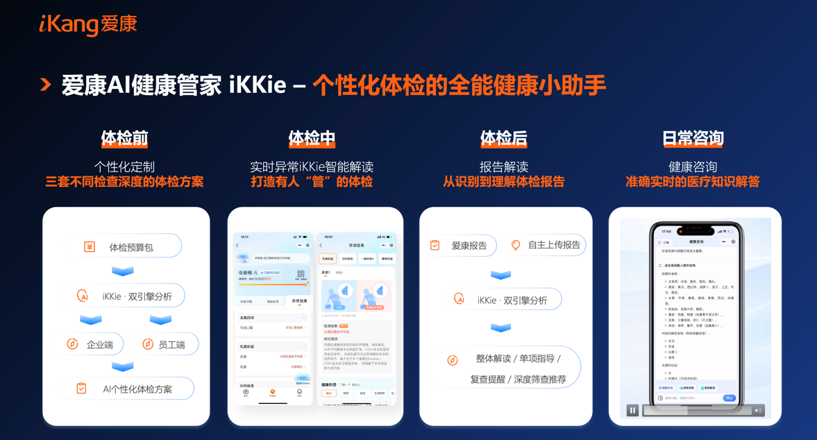 同时,爱康在2023年推出的首个AI健康管家——iKKie,其服务已覆盖检前定制、检中辅助、检后管理全链路。依托“强医学规则+AI大模型”双引擎驱动,iKKie能根据用户历史体检数据、家族病史、生活方式等信息,定制标准版、升级版、加强版个性化体检套餐,实现“千人千检”的精准健康管理。
