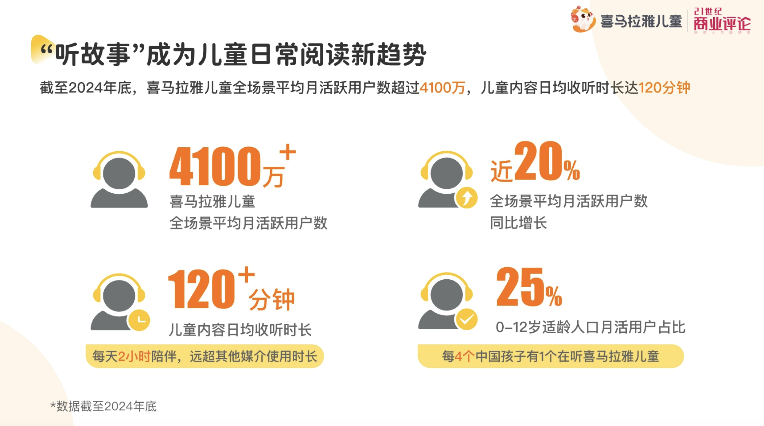 儿童对广播剧等音频内容形式的接受度早已得到验证。数据显示,截至2024年底,喜马拉雅儿童全场景平均月活跃用户已超4100万,月活用户数占中国0-12岁适龄儿童人口的25%,相当于每4个中国孩子就有1个在喜马拉雅儿童收听故事。内容供给上,喜马拉雅儿童内容声音条数超1.2亿,专辑超990万张,覆盖睡前故事、儿童文学、科普百科、国学诗词、历史名著等热门类目。