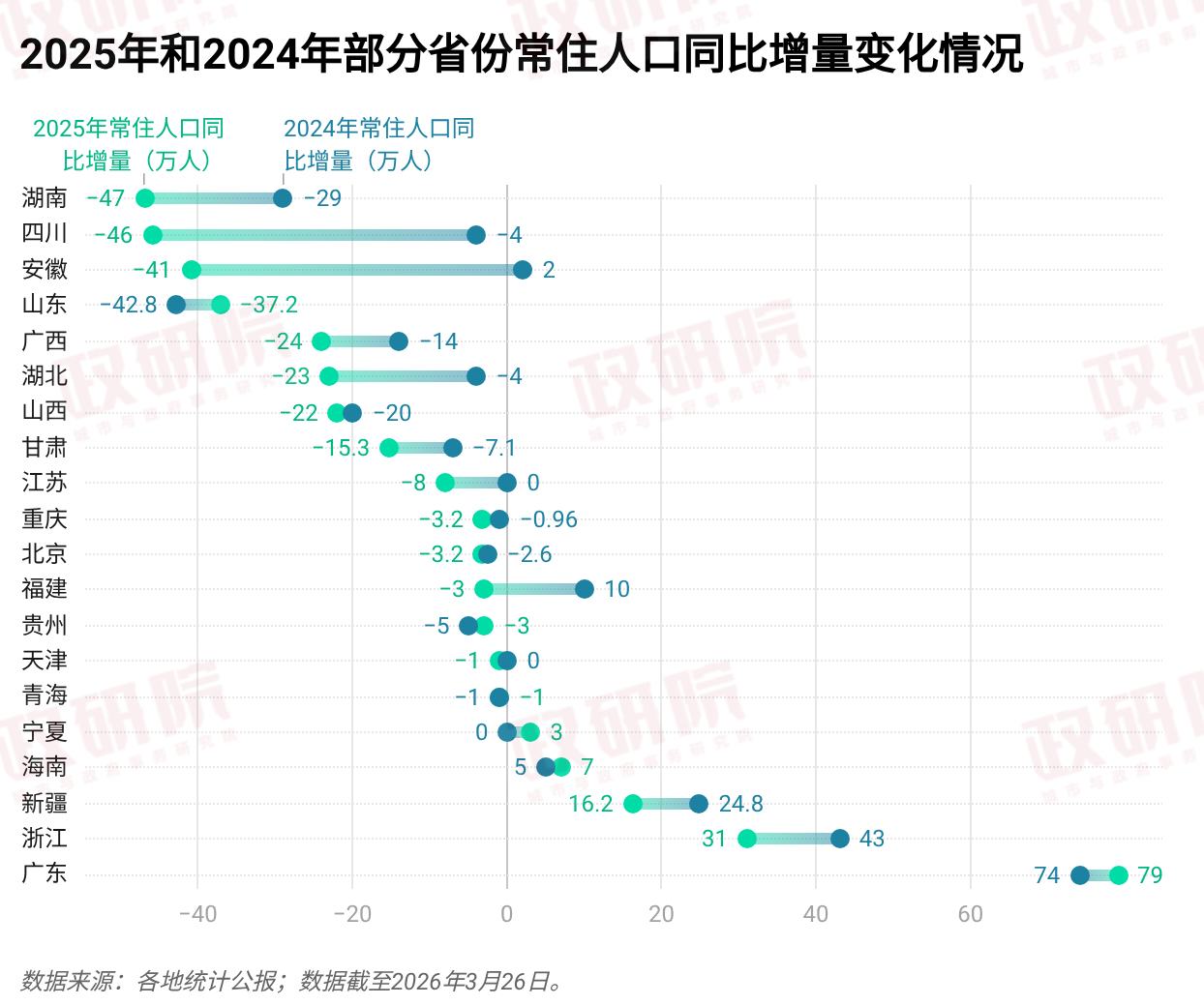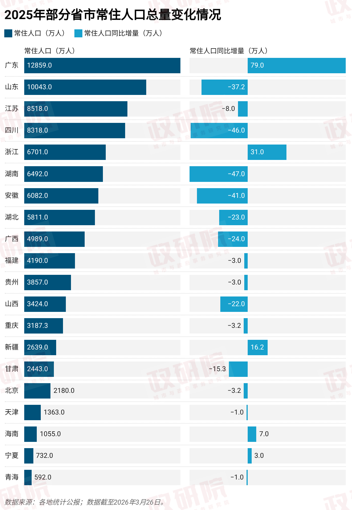 截至2026年3月26日,全国已有20个省份公布了2025年常住人口数据。从全国层面看,2025年全国人口减少339万,连续4年负增长,自然增长率降至-2.41‰。在此宏观背景下,各省人口表现分化明显——仅有广东、浙江、新疆、海南、宁夏5个省份实现常住人口增量上涨,其余省份均面临不同程度的人口下降压力。