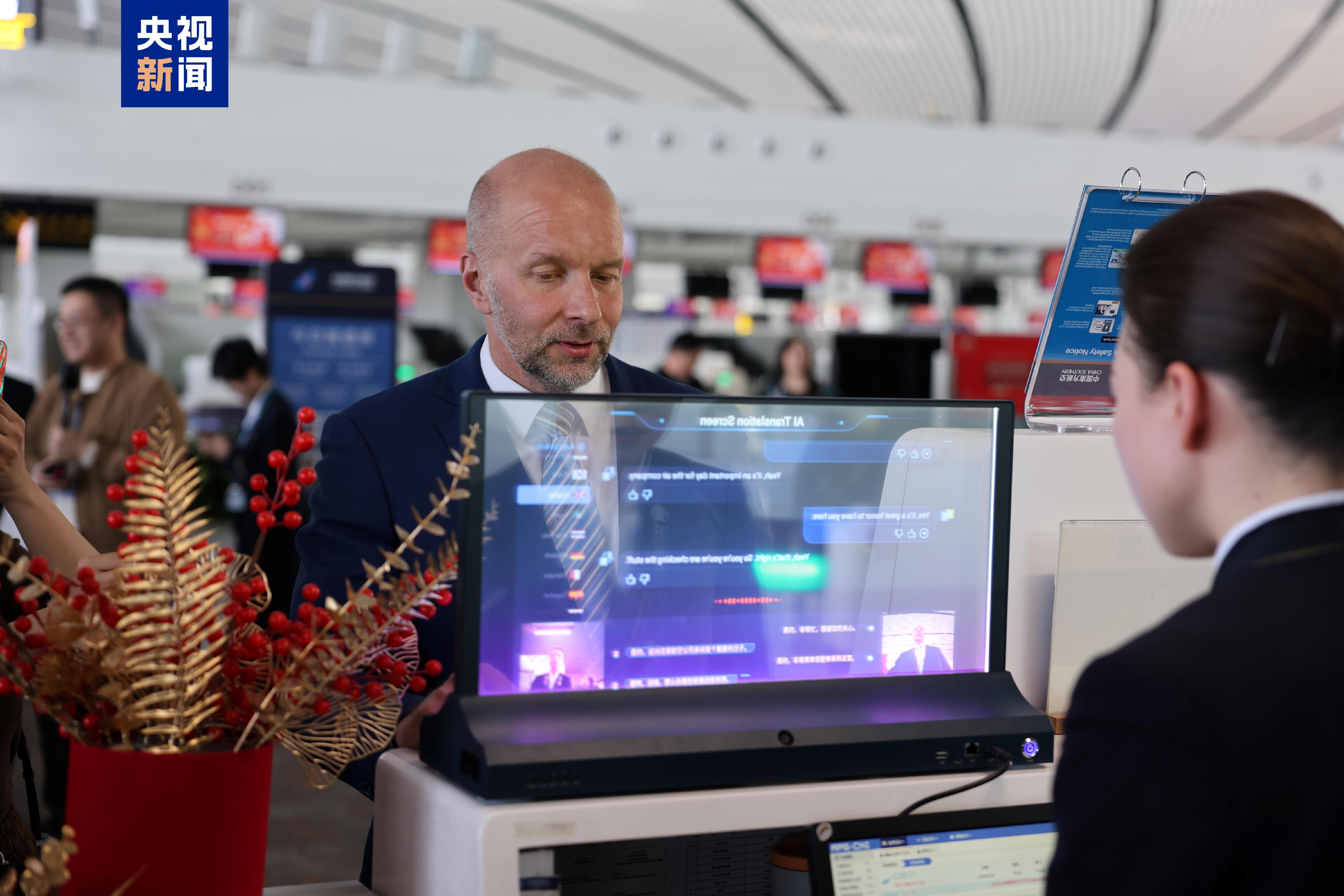 为保障新航线顺畅运行,南航在大兴机场加开多个值机专柜,及时为旅客提供证件咨询、行李托运等服务引导,工作人员通过“柜台号码牌”,引导旅客“随到随办”,协助旅客快速值机通关;同时进一步升级值机柜台的多语种AI透明翻译屏,融合可视化翻译、双面透明显示与智能咨询服务功能,为旅客提供语言实时互译等一站式服务。