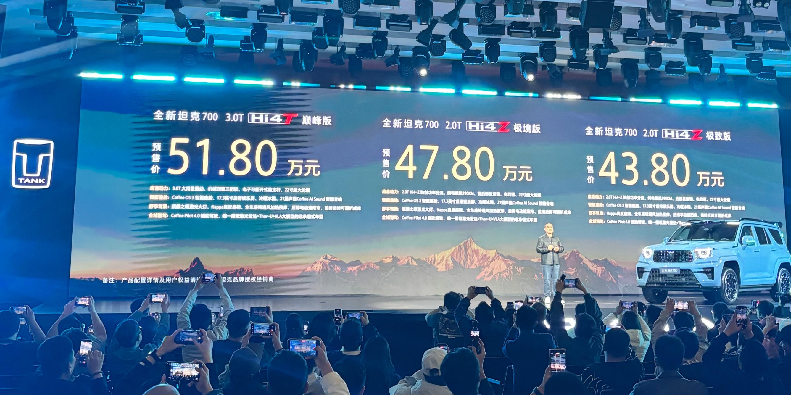作为长城汽车旗下目前售价最高的车型,坦克700正式迎来升级。3月30日,全新坦克700开启预售,推出3.0THi4-T、2.0THi4-Z两大动力版本,共三款车型,官方预售价区间为43.80万至51.80万元。