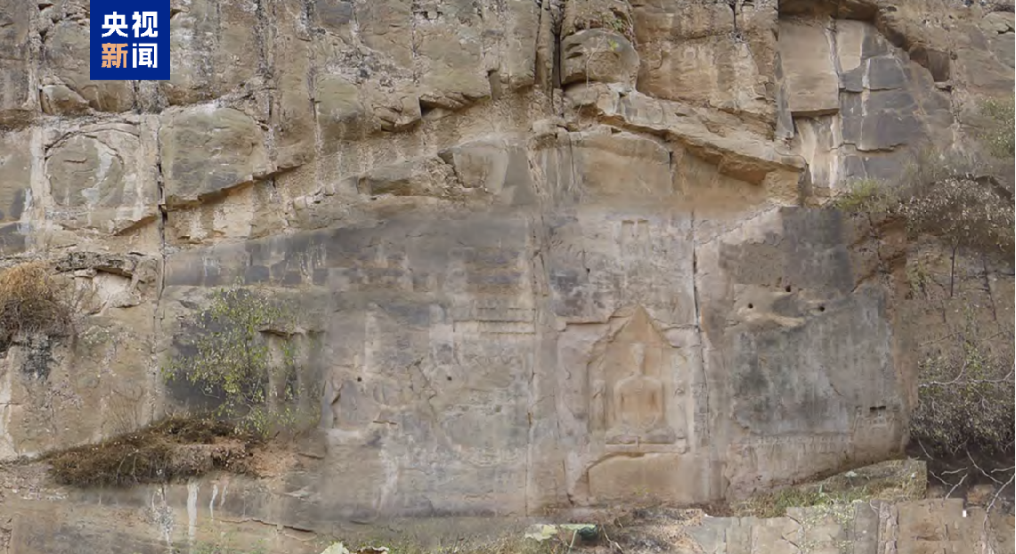 摩崖造像位于崖壁中部,正中为造像大龛,千佛龛、发愿文及供养人题记等围绕大龛展开。