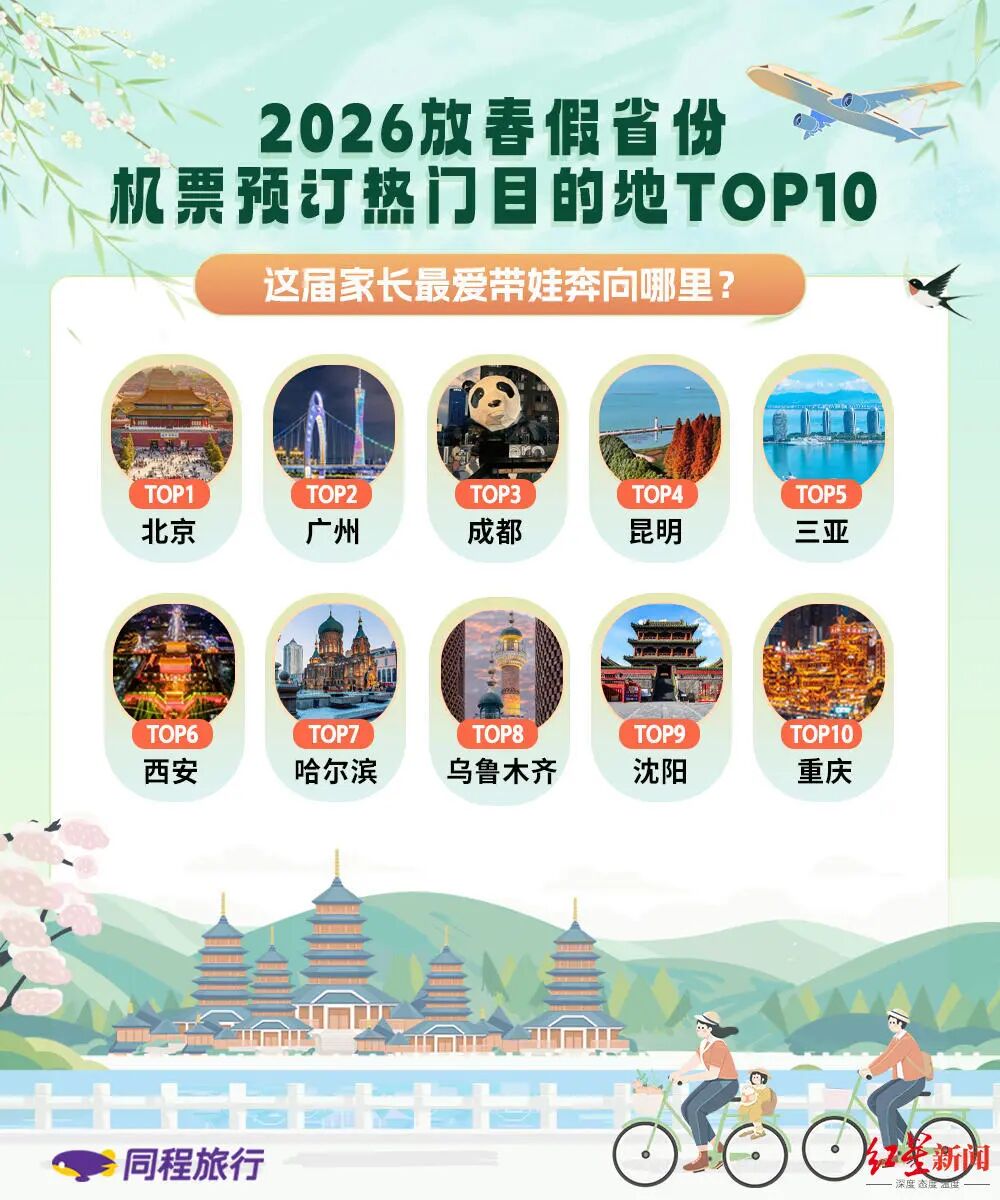 六天假期拉长出游半径,带动机票预订热度一同上涨。数据显示,平台上4月1日-6日出发的机票预订热度同比上涨约两成。春假国内机票预订十大热门目的地包括北京、广州、成都、昆明、三亚、西安、哈尔滨、乌鲁木齐、沈阳、重庆。去哪儿旅行数据显示,4月1日,成都是全国乘飞机出发量最多的城市,在最热门酒店入住城市中,成都也位列第一方阵。