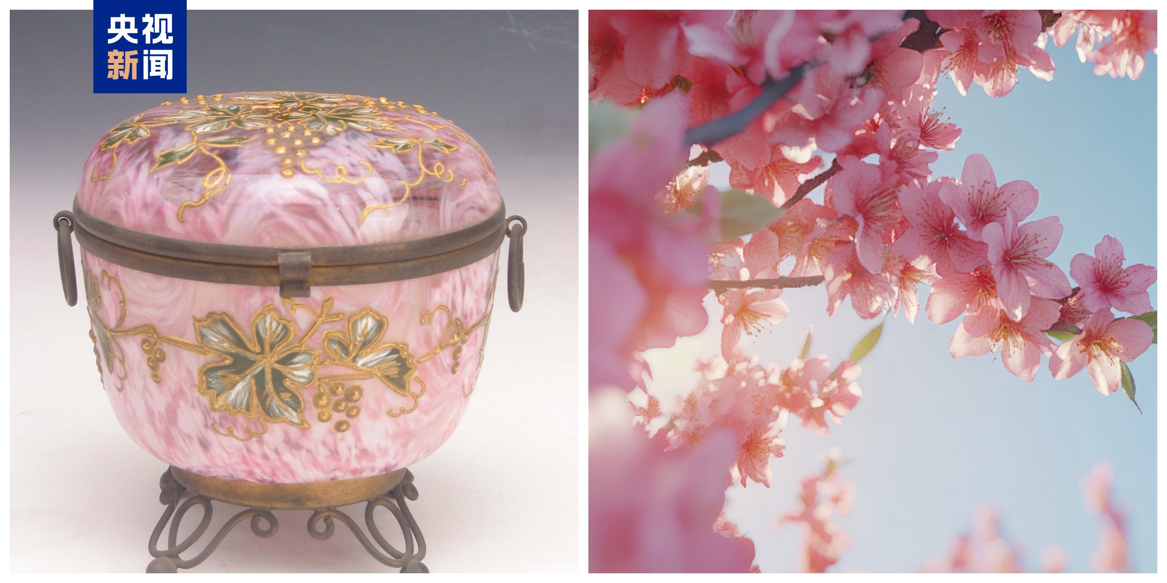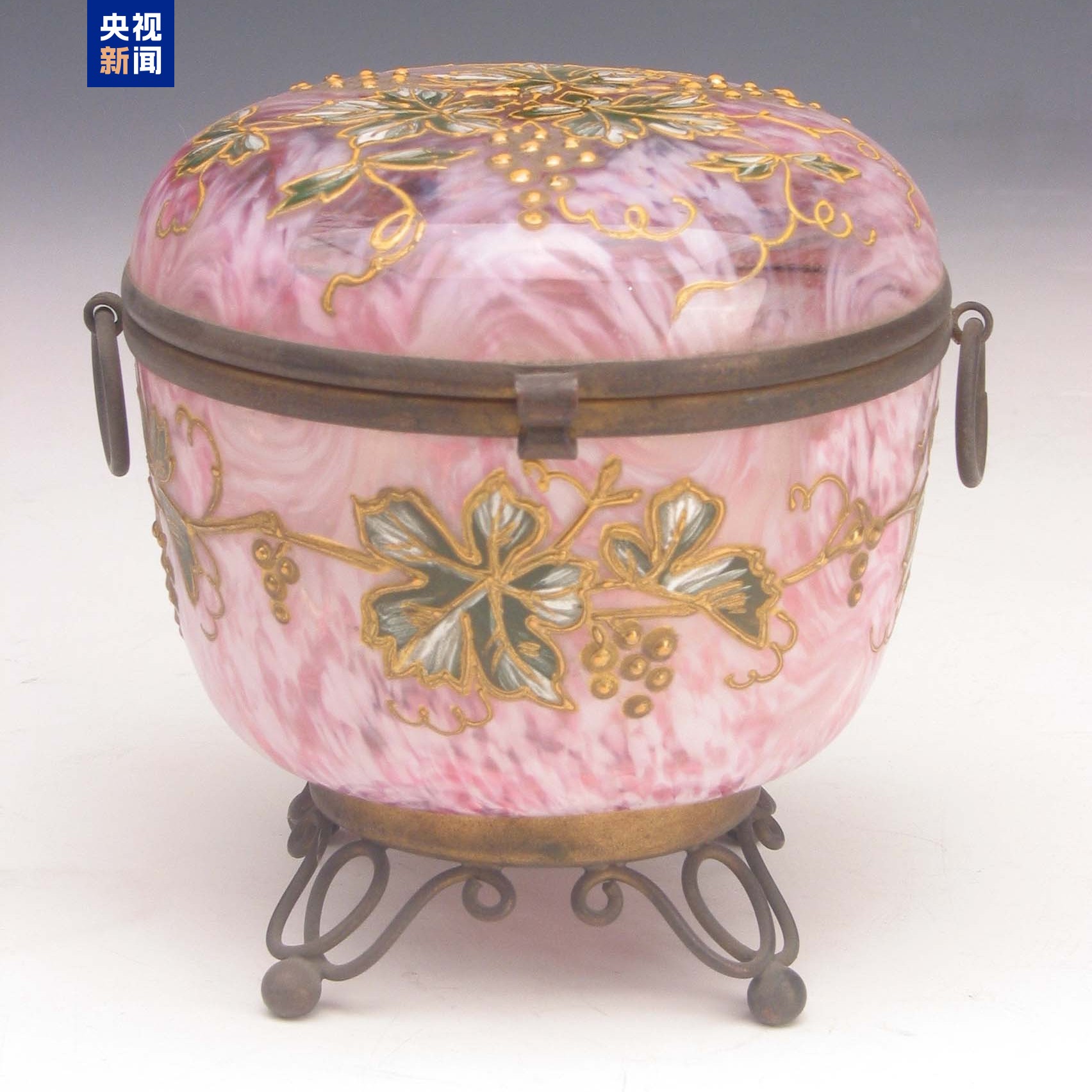 这件粉玻璃葡萄花双环耳盒的惊艳
