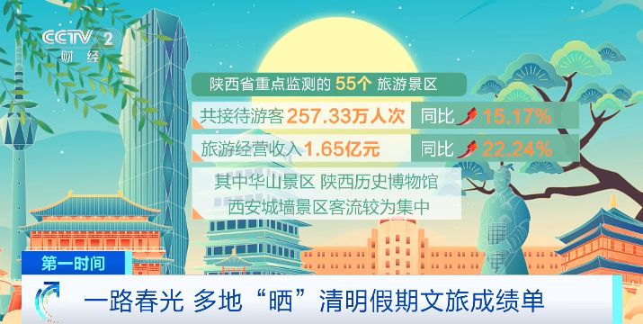 清明假期,陕西省重点监测的55个旅游景区共接待游客257.33万人次,同比增长15.17%;旅游经营收入1.65亿元,同比增长22.24%。其中华山景区、陕西历史博物馆、西安城墙景区客流较为集中。