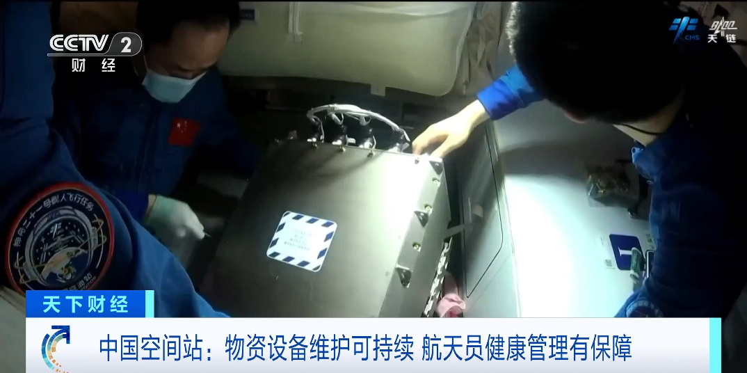 在微重力物理科学领域,实验项目按计划推进。乘组更换了流体物理实验柜内样品、燃烧科学实验柜内燃烧器和气瓶,并完成了无容器柜实验腔体样品清理、轴心机构电极维护等工作。