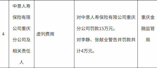 日前,国家金融监督管理总局重庆监管分局发布了罚单,涉及中意人寿保险有限公司重庆分公司及其相关责任人。罚单显示,中意人寿保险有限公司重庆分公司的主要违法违规行为是虚列费用。