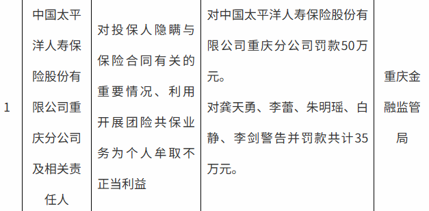 处罚信息显示,中国太平洋人寿保险股份有限公司重庆分公司因两项违法违规行为被处罚:一是对投保人隐瞒与保险合同有关的重要情况;二是利用开展团险共保业务为个人牟取不正当利益。