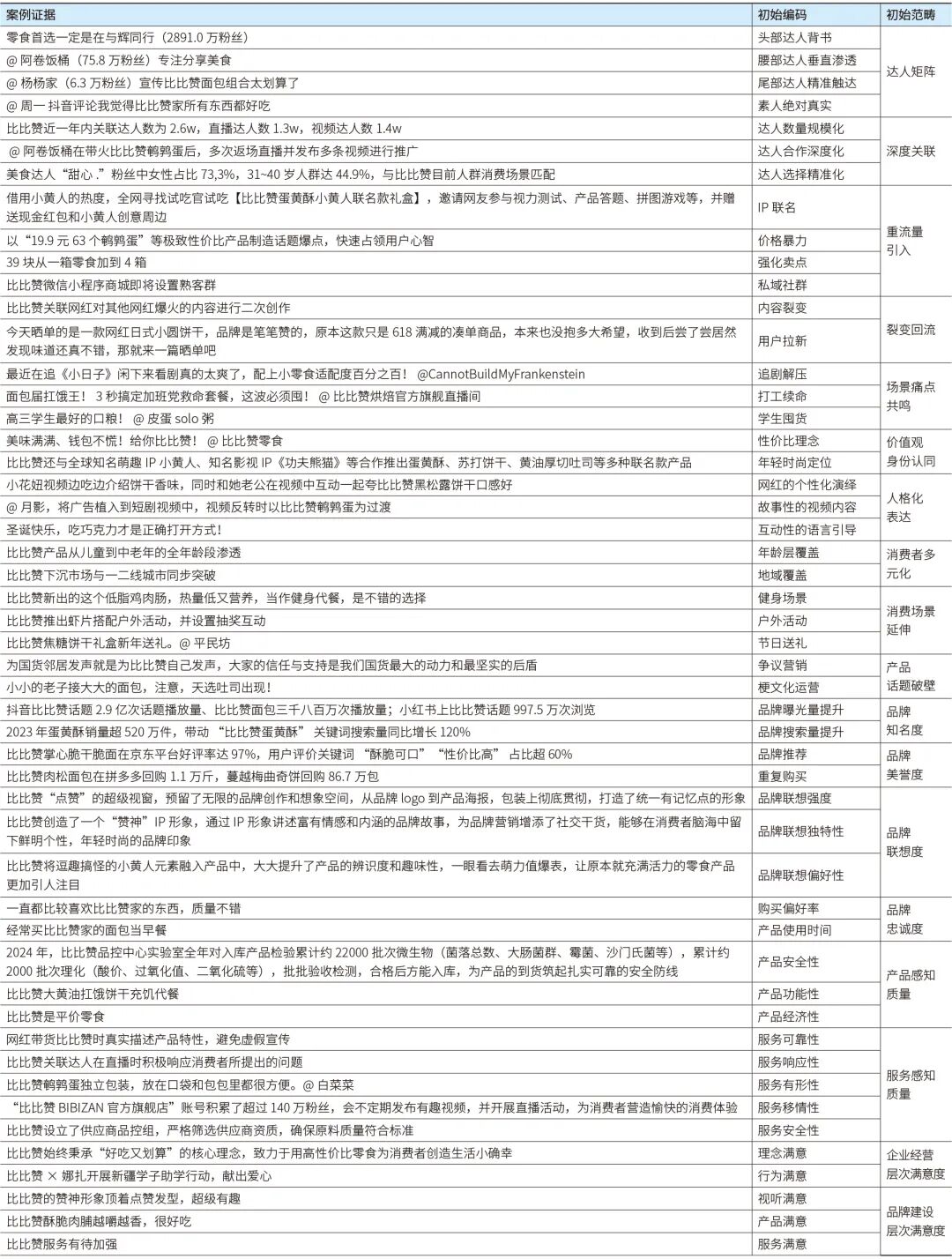 回顾比比赞的发展历程,通过与不同层级网红的深度合作,通过场景化内容强化用户共鸣,结合“追剧零食”等生活化剧情植入,降低广告属性,以情感链接激发购买欲望,将短期爆品势能转化为长期复购,比比赞不仅实现了流量的高效转化,更完成了品牌形象的升级。在流量为王的时代,比比赞的成功印证了网红营销的强大生命力,也为行业提供了通过网红生态构建品牌影响力、驱动商业增长的经典范例。(见表4.1)