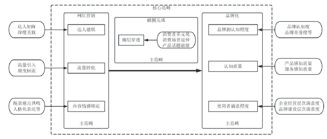 在选择式编码中,研究者发现一个核心领域,通过描述“故事线”将核心范畴与其他范畴系统地连接起来,进一步完善现有的理论[29]。通过选择式编码,本研究得到“故事线”:比比赞通过与不同层级达人建立紧密合作,配合场景化内容营销以及流量转化策略,破圈并得到消费者认可,最终实现品牌化。其中达人分层、内容情感绑定、流量转化共同构成网红营销这一范畴;圈层穿透构成破圈完成这一范畴;品牌的认知程度、认知质量、使用者满意程度共同构成品牌化这一范畴。