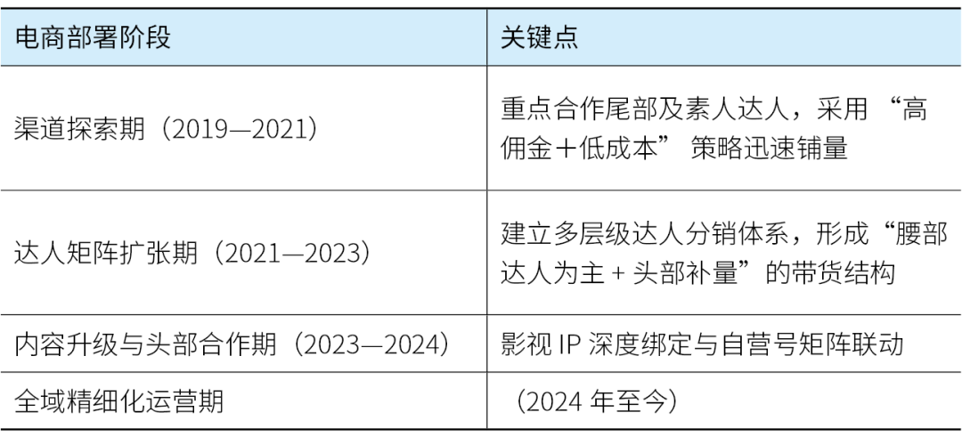 第一阶段:渠道探索期(2019—2021年)。这个时期尚未形成规模化网红营销体系。品牌通过少量区域性达人合作测试市场反应,重点合作尾部及素人达人,通过“高佣金+低成本”迅速铺量。