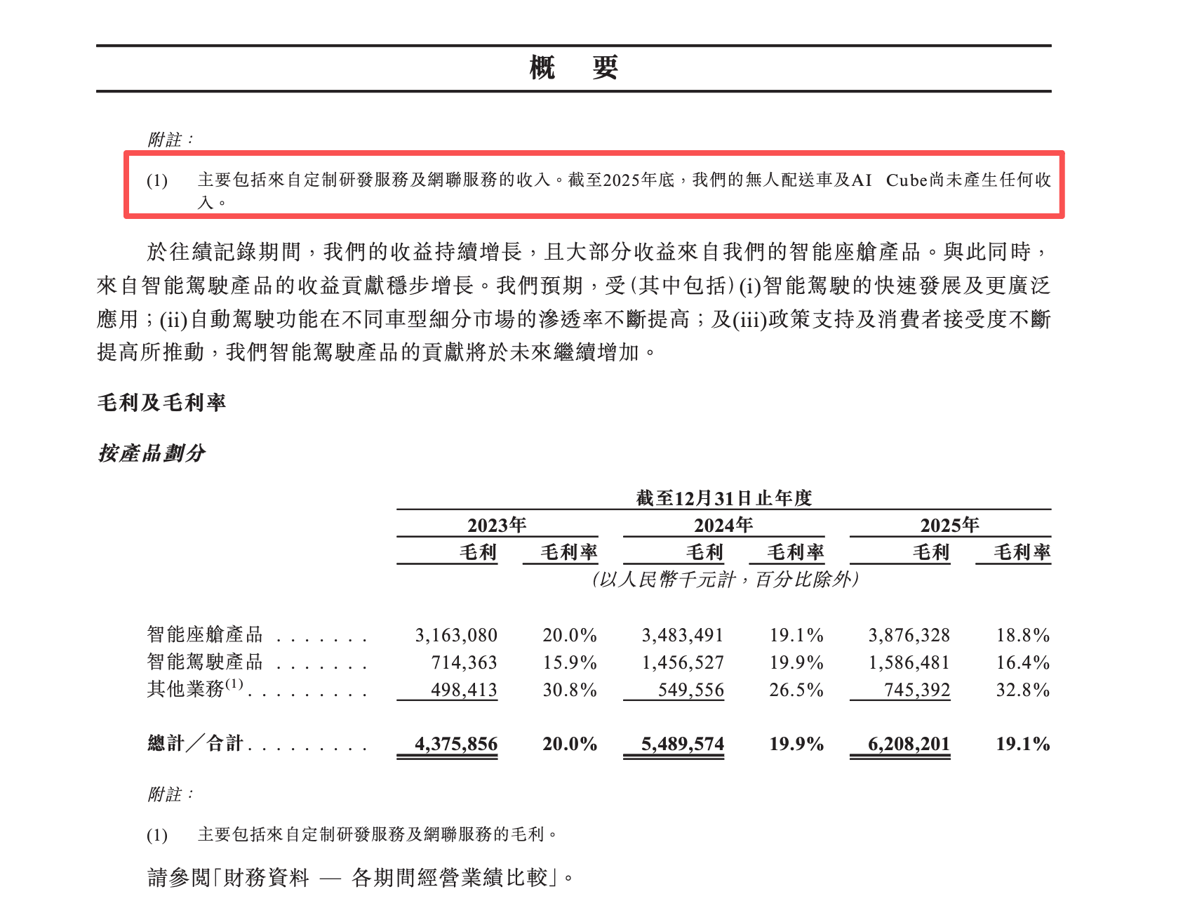 招股书中有一处值得注意的披露:截至2025年末,公司无人配送车及AI Cube尚未产生任何收入。结合整体收入结构来看,这一信息的含义并不局限于单一业务。