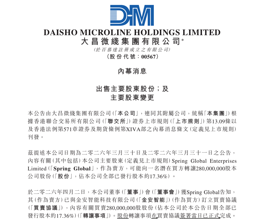 根据大昌微线4月7日发布的公告,其主要股东Spring Global与金安智能订立买卖协议,转让所持有的2.8亿股公司股份,占大昌微线全部已发行股本的17.36%,且该股份转让事项在协议签署当日已正式完成。