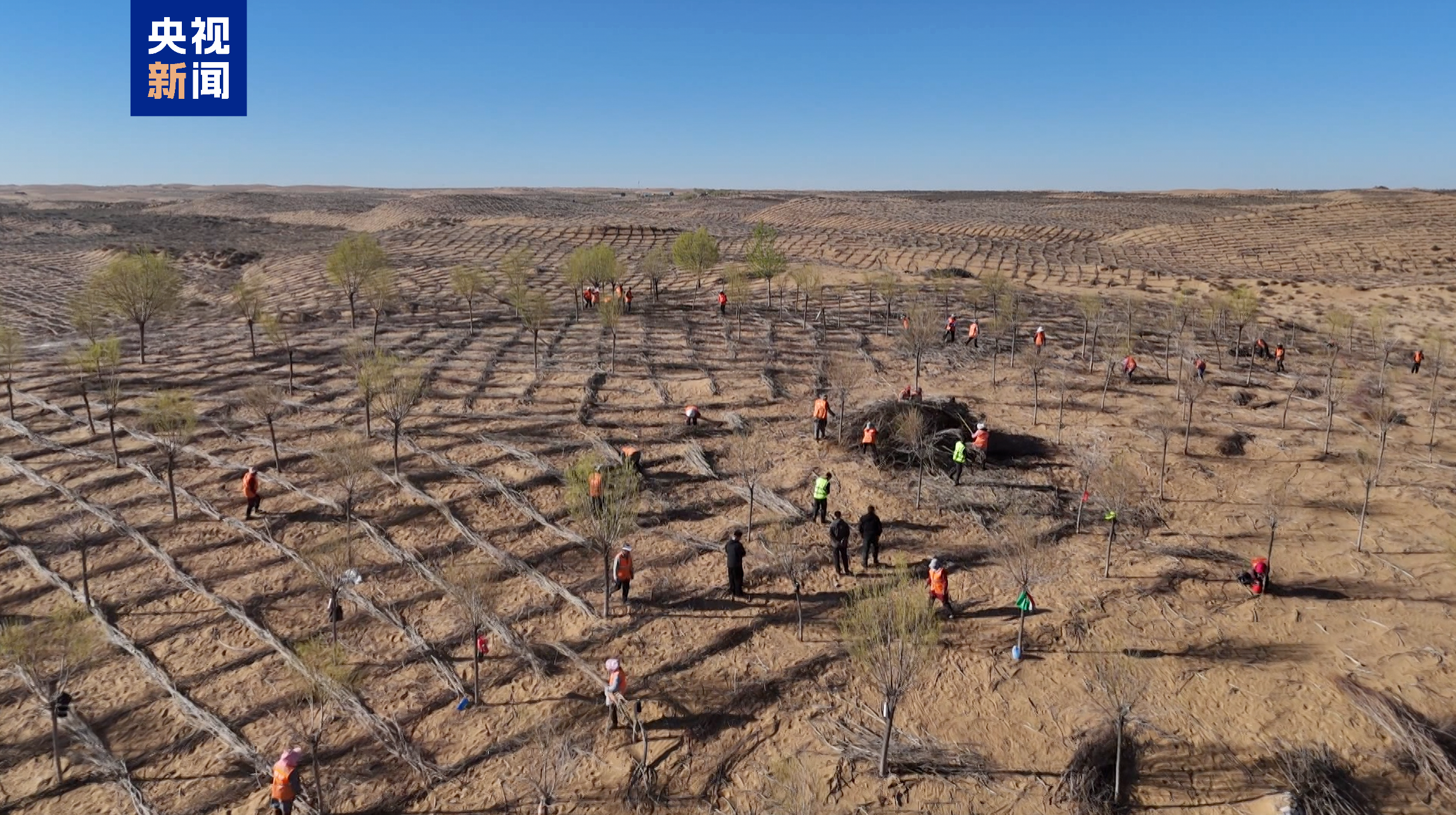 这几天,通辽市科左后旗甘旗卡镇束力古台嘎查热闹非凡。200多名干部群众分工协作,铺设草方格、栽种新树苗,各种治沙机械轰鸣作业。从空中俯瞰,一片片草方格如棋盘般锁住流沙,新栽的苗木在春风中扎根,为黄沙披上“绿装”。