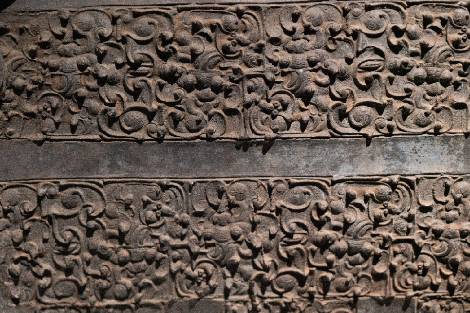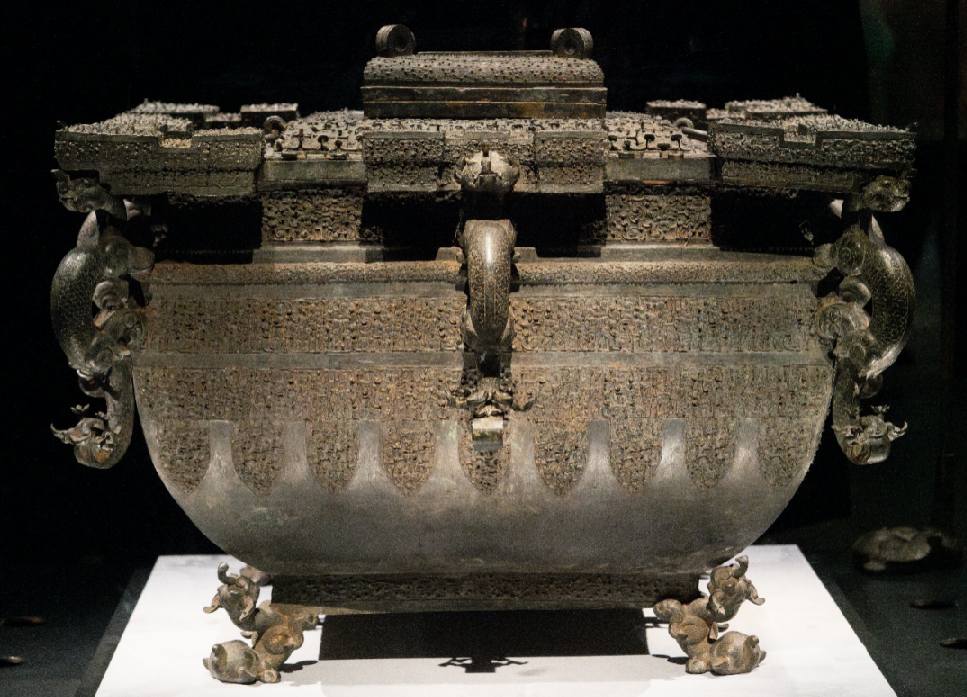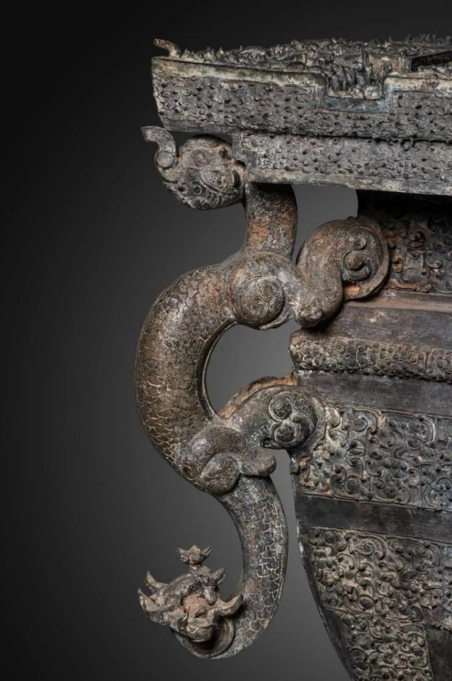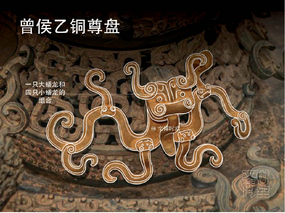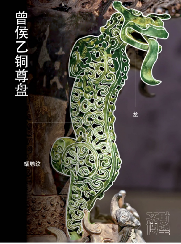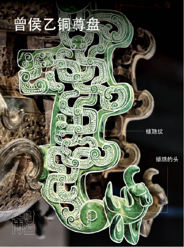 整套尊盘最令人叹为观止的,是其鬼斧神工的镂空装饰。工匠运用失蜡法,将复杂的纹饰分解成无数独立的铜梗,这些铜梗彼此交错、层层堆叠,构建出一个玲珑剔透的微观世界。尊体装饰有28条龙、32条蟠螭,盘体则更是繁复,饰有56条龙、48条蟠螭,这些细密的纹饰竟是一体浇铸成型,毫无瑕疵。这种极尽奢华的工艺,突破了商周青铜器庄重有余而灵动不足的传统,展现了战国时期楚系青铜文化独有的浪漫与狂放,被誉为“青铜时代的绝响”。