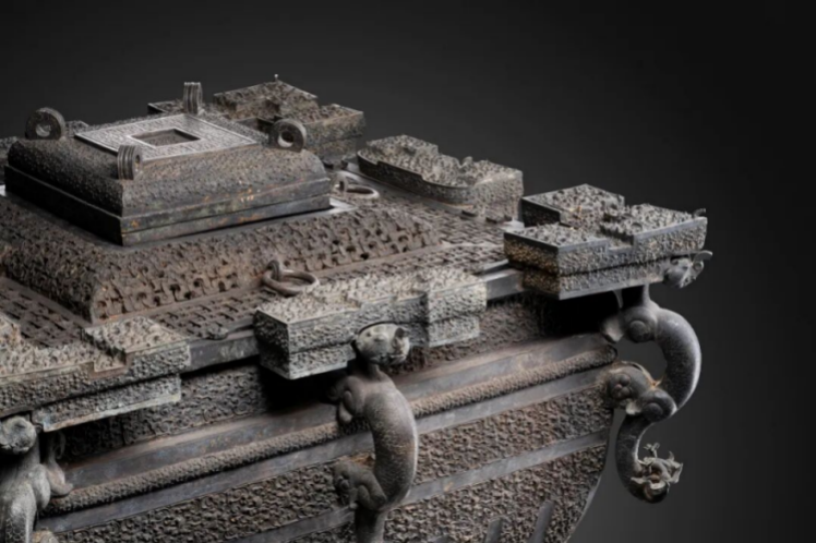 3、四角及每面正中设拱曲攀伏龙形耳钮,龙尾缠小龙、缀五瓣小花