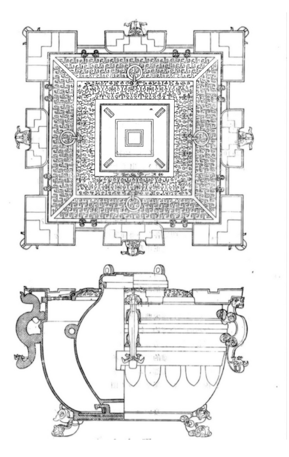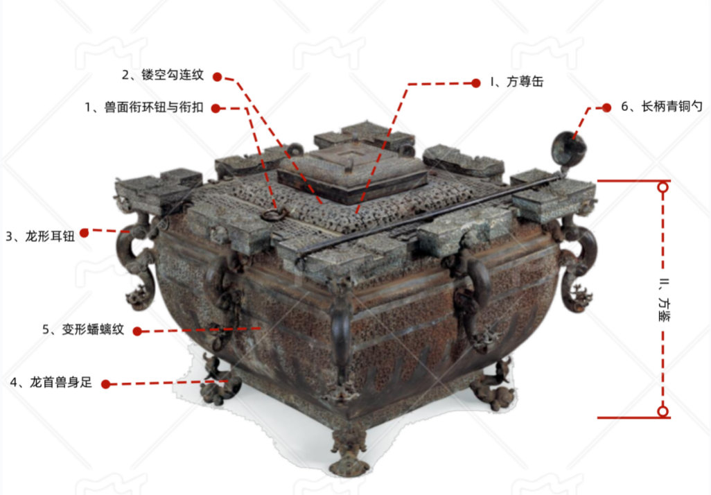 方鉴内套方尊缶,俯视呈“回”字状。方尊缶盖面饰繁缛镂空勾连纹和蟠螭纹,开合便捷,便于舀酒添冰。还配一把长柄青铜勺,勺的长度足以探到尊缶内底。