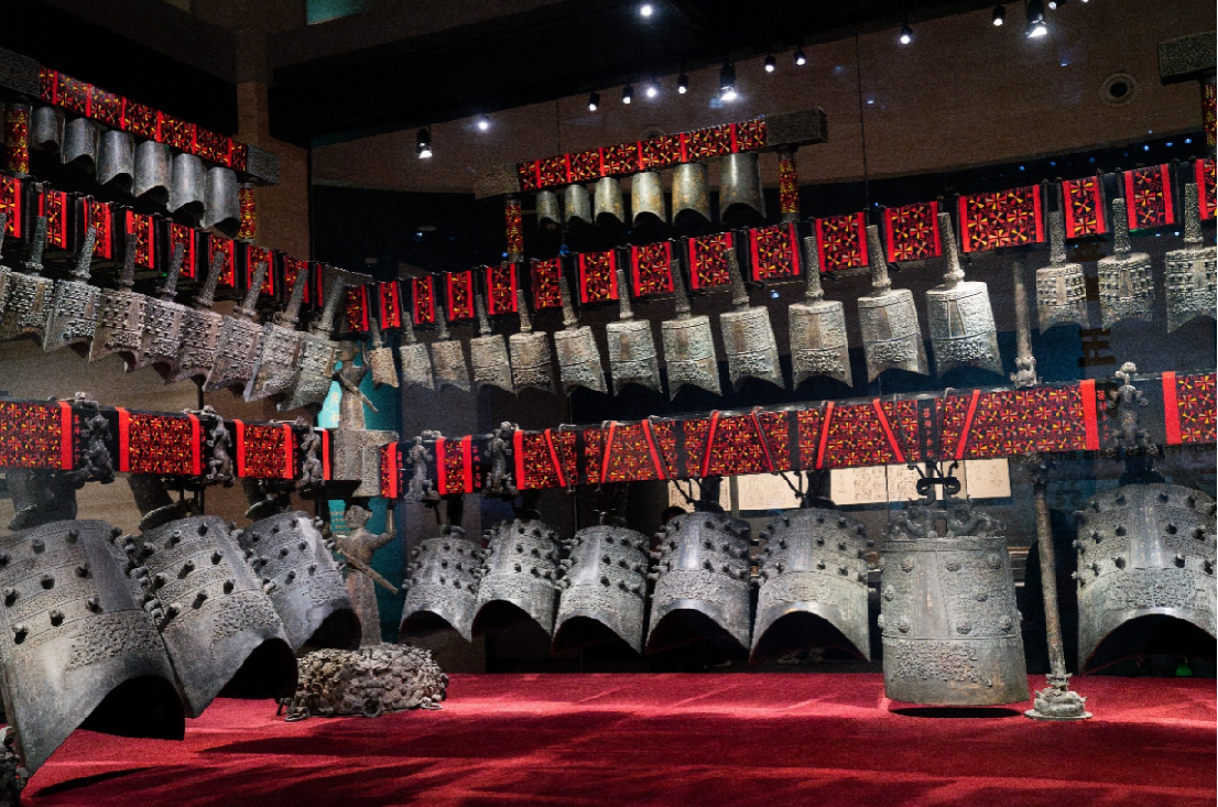 不仅规模空前,其铸造工艺与音乐性能更是达到了先秦时期的巅峰。钟体与钟架上铸刻有3755字铭文,详细记录了编号、记事、标音及乐律理论,还清楚地表明这些阶名与晋、楚、周、齐、申等各国律调的对应关系,堪称一部活的先秦音乐史。整套编钟音域宽广,跨越五个半八度,中心音区十二个半音齐备,能自如演奏五声、六声乃至七声音阶的乐曲,具备完整的十二律及其乐音体系。出土时,随葬的六个丁字形彩绘木槌和两根彩绘木棒静卧其侧,仿佛随时等待着乐师的敲击,再次奏响穿越两千四百年的金石之声。