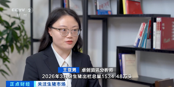 卓创资讯分析师 王亚男:根据13家上市猪企公开的财报数据显示,2026年3月份生猪出栏总量1534.48万头,环比增加37.31%,同比增加6.09%。其中有54%的企业月出栏同比增加在18%以上,当前生猪出栏量仍然处于增加态势。
