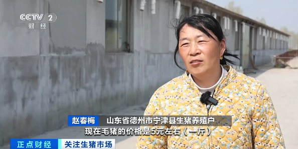 山东省德州市宁津县生猪养殖户 赵春梅:现在毛猪的价格是5元左右(一斤),原先(去年同期)的价格在7元左右(一斤),(出栏)一头猪亏损200多元。