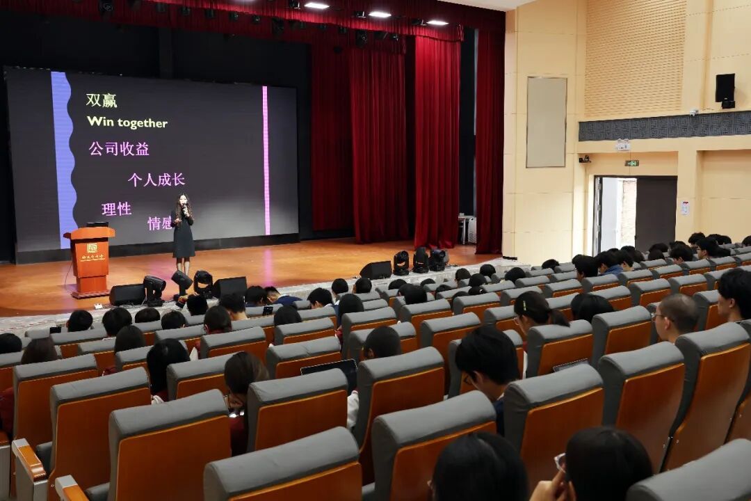 讲座刚开场,张蕾就用中文、英文、法语、西班牙语、日语、等多种语言向同学们问好!一句“Bonjour”瞬间点燃了全场气氛,也让大家直观地感受到了跨国企业多元文化交织的工作环境。