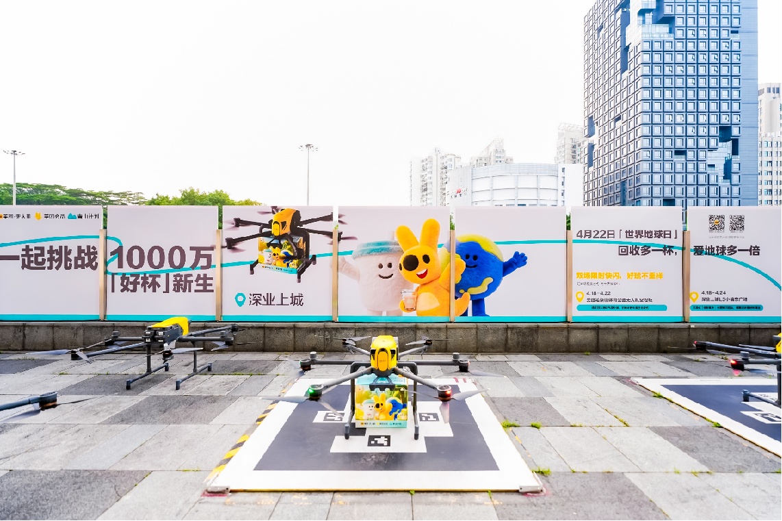 活动现场设置了丰富多样的互动环节,将公益环保与商业消费巧妙结合。4月22日前,市民只需在活动现场回收1个“好杯”(废弃塑料杯等),即可获得无人机外卖券。