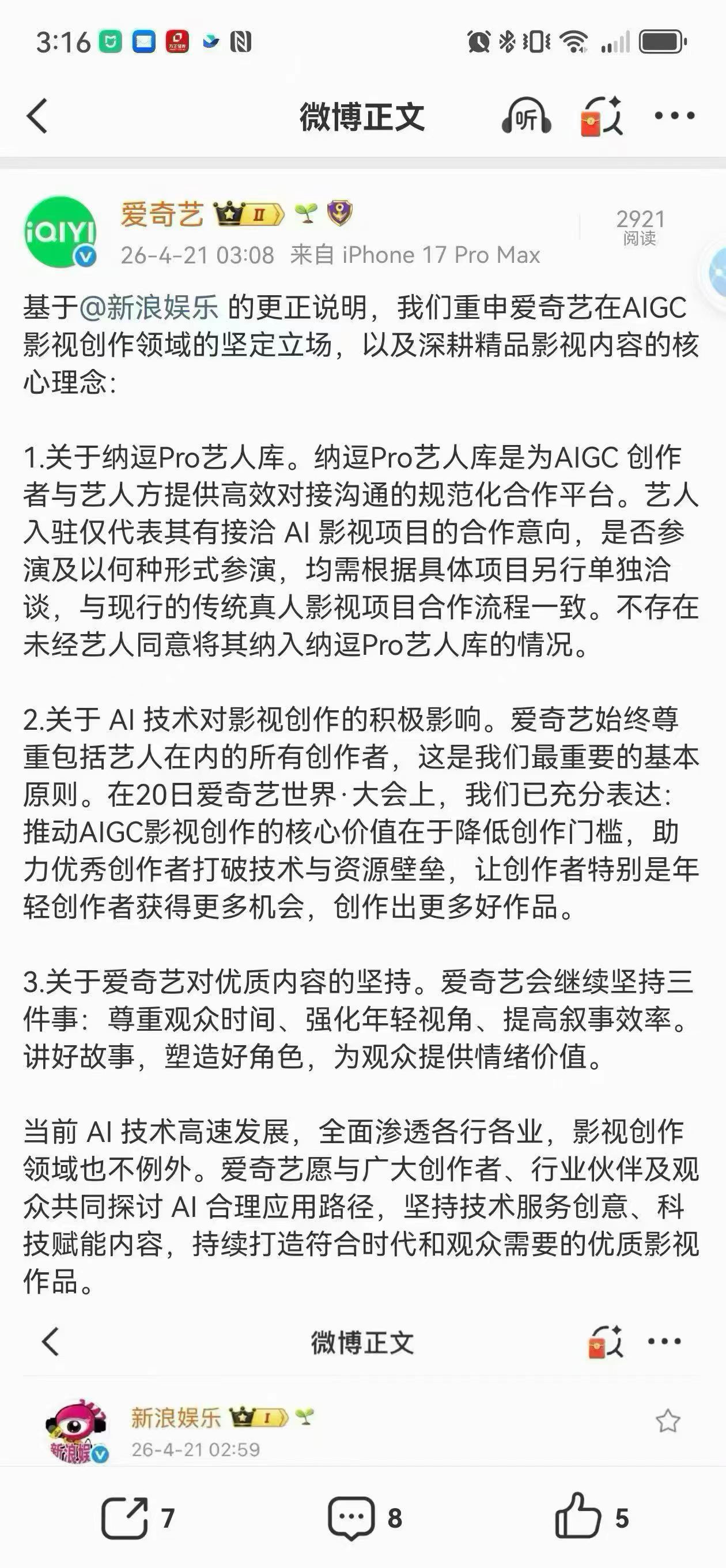 4 月 21 日凌晨,爱奇艺官方微博再度发布声明,针对前一日引发行业热议的 AI 艺人库争议作出第二次公开回应,基于新浪娱乐此前发布的更正说明,重申平台在 AIGC 影视创作领域的立场与规范,厘清艺人库运作模式。