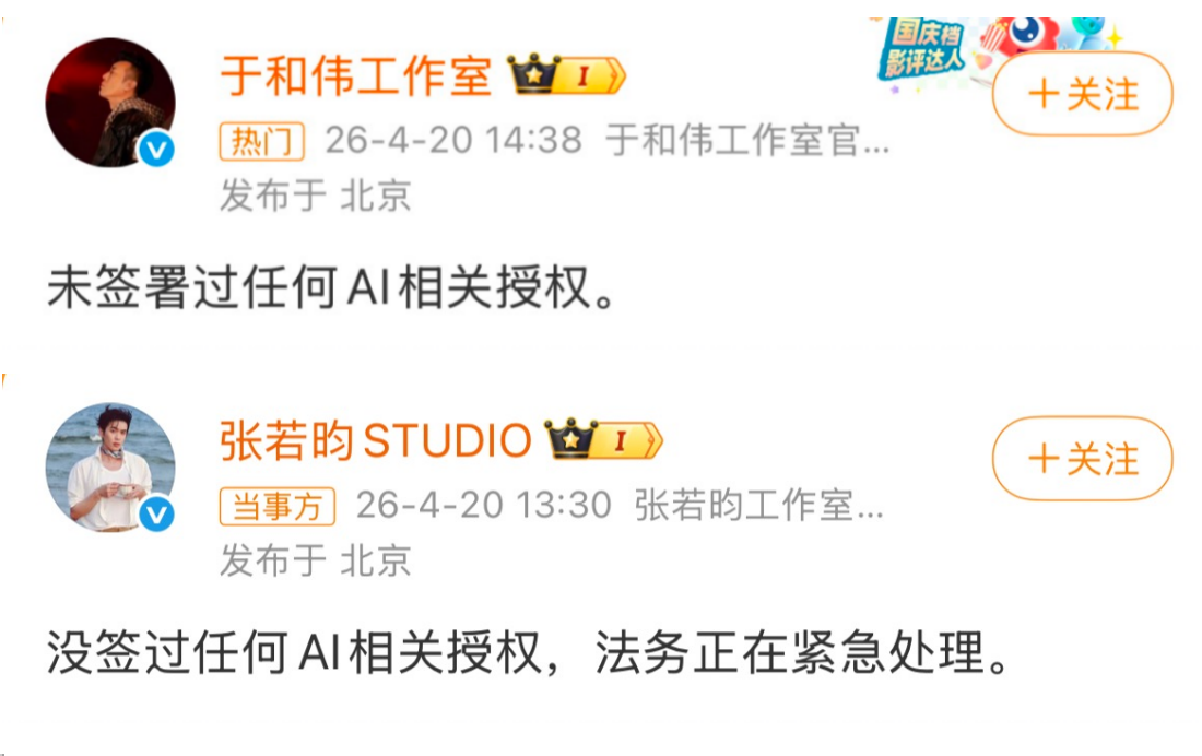 大会期间及会后,部分社交平台与媒体传播的艺人名单中,出现于和伟、张若昀、王楚然等艺人名字。当日下午起,上述艺人的工作室陆续通过官方微博发布声明,明确表示“未签署过任何 AI 相关授权”,其中张若昀工作室更提及“法务正在紧急处理”。艺人方的集中辟谣,与平台此前的官宣形成信息反差,将 AI 艺人库争议推向高潮。