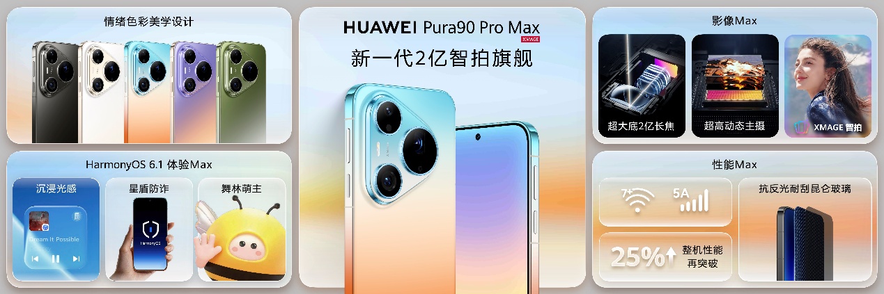 性能与续航上,华为Pura 90系列搭载抗反光耐刮昆仑玻璃、5A速度信号优化、超大电池超长续航,再加上麒麟新芯与鸿蒙6.1系统的协同,天生快、一生快的流畅体验再跃升。