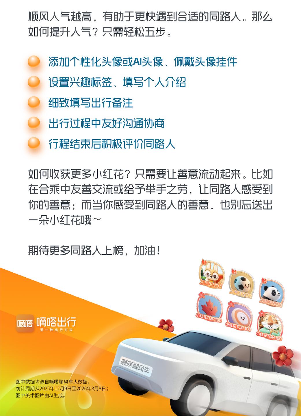 可以说,顺风人气高,让合乘友好度高的用户更顺利且快速合乘,而顺风人气榜则让他们因友好合乘而被更多同城同区用户认可,进而鼓励更多人去主动提升合乘友好度,让自己,也让大家的顺风合乘更高效,体验更愉悦。