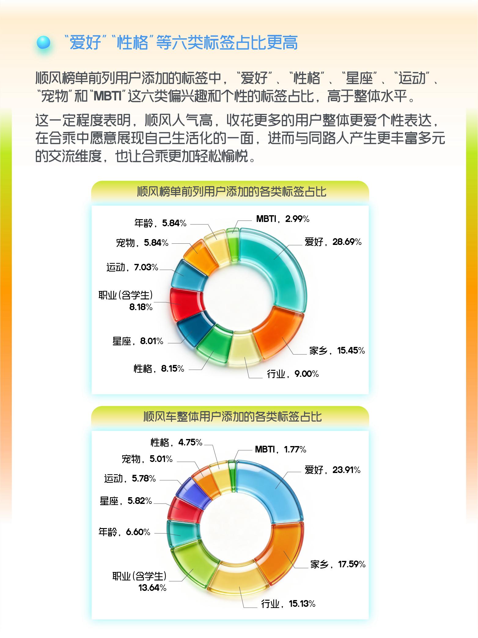 整体看,在顺风榜单前列用户添加的标签中,“爱好”、“性格”、“星座”、“运动”、“宠物”和“MBTI”这六类偏兴趣和个性表达标签占比,高于整体水平。比如,榜单前列用户的爱好标签和性格标签占比分别为,28.69%和 8.15%,而顺风车用户添加的爱好和性格标签整体占比为23.91%和4.75%。