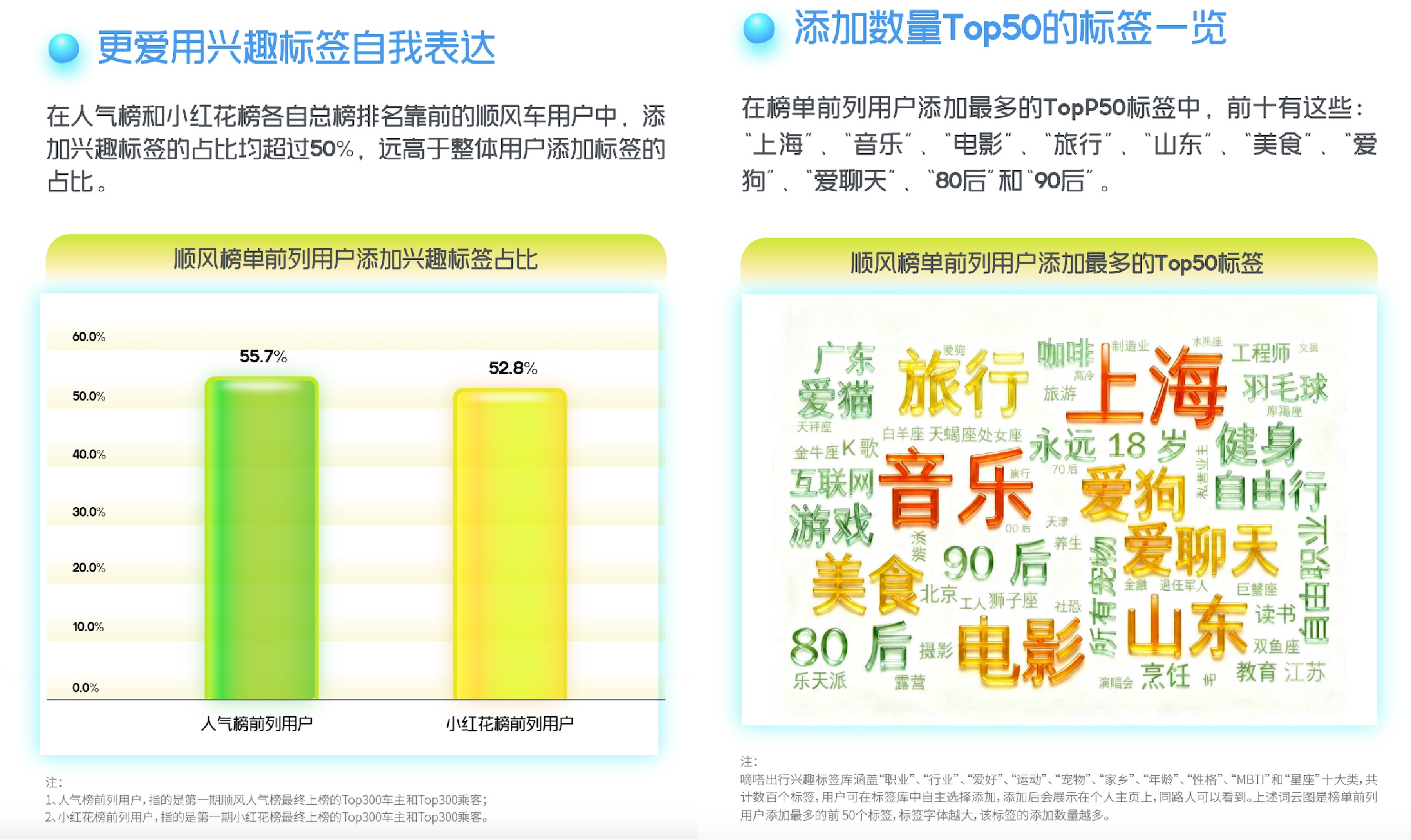 4、榜单前列用户,设置兴趣标签的占比超过5成,远高于顺风车用户设置标签整体占比。这一定程度表明,人气高和收花多的用户,相对更爱通过展示标签来自我表达。