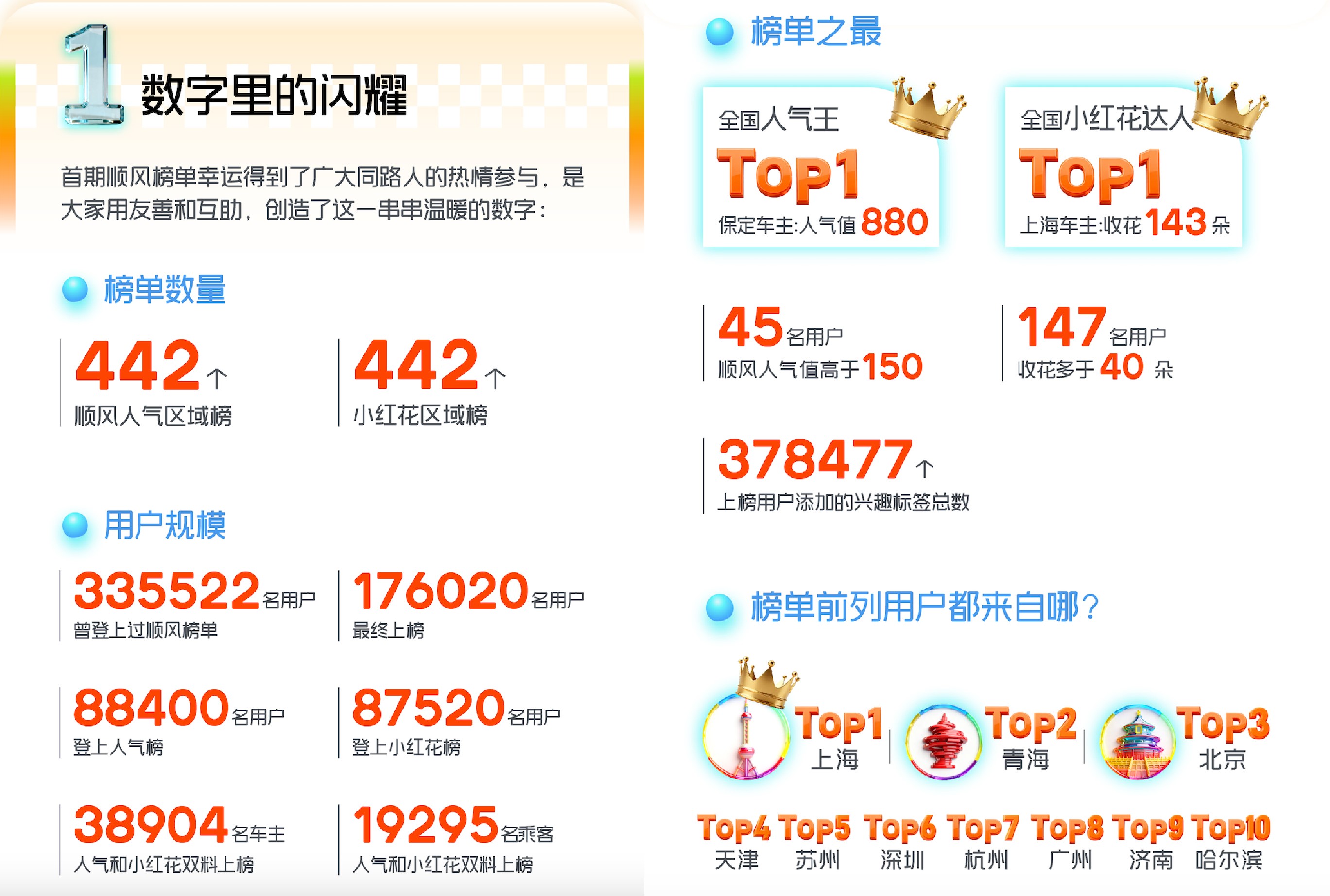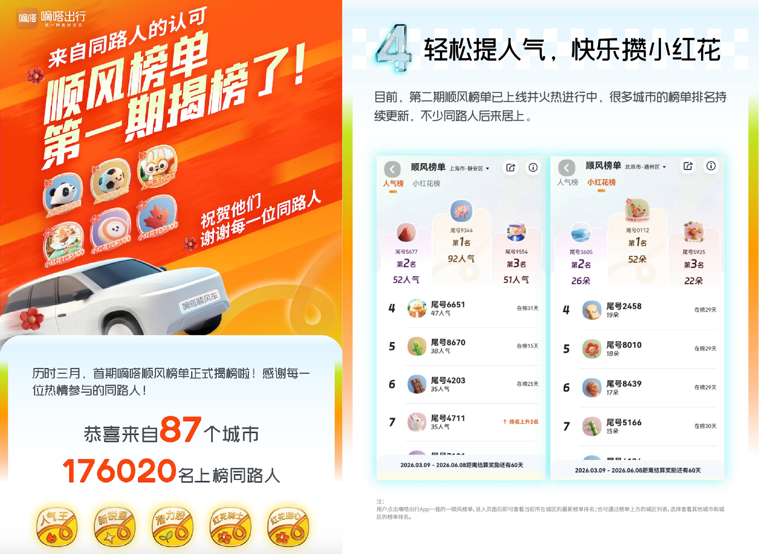 这是嘀嗒顺风车全体用户在各自区域内的第一次认可度大PK:在87个城市共产生442个人气区域榜和442个小红花区域榜;共计176020名用户登上首期榜单,其中88400名用户登上人气榜,87520名用户登上小红花榜;顺风人气最高的是一位保定车主,人气值高达880,收花最多是一位上海车主,3个月内共收到143朵小红花。