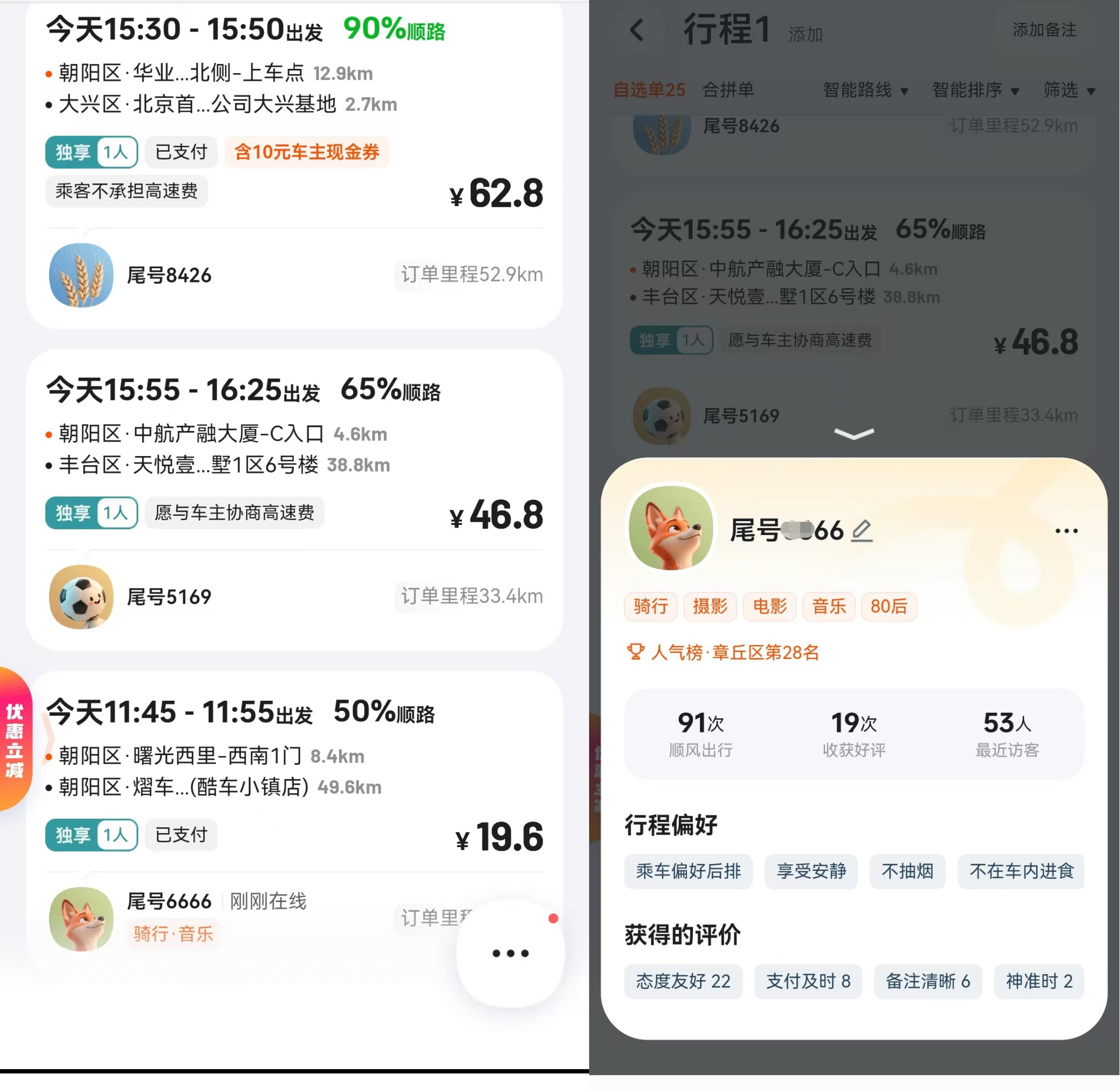 而事实上,通过订单雷达页查看潜在同路人的个人主页,可以查看到多维度信息,比如个性化头像、兴趣标签、合乘次数、好评率、信用分、最近访客数、具体评价、榜单排名、行程偏好等,这从自我描述、平台评价和同路人评价三个维度,为用户勾勒出一幅综合立体的合乘友好度画像,为同路人选择是否合乘,提供了充分参照。