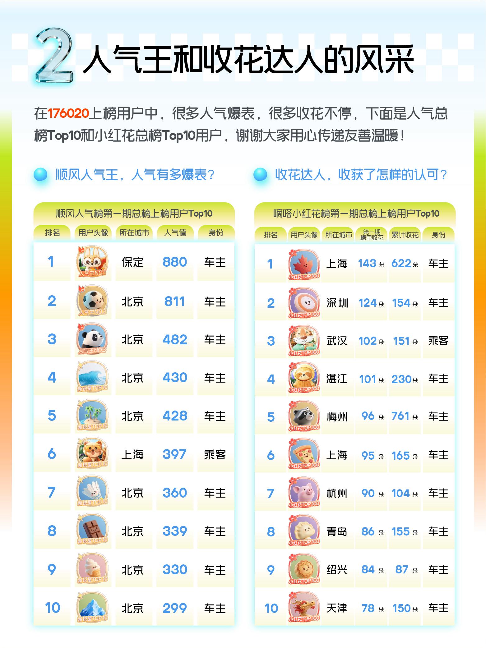 1、同时登上人气榜和小红花榜的双料上榜用户有近六万名,其中包括38904名车主和19295名乘客,这一定程度印证了用户人气高和被点赞之间的正相关性。