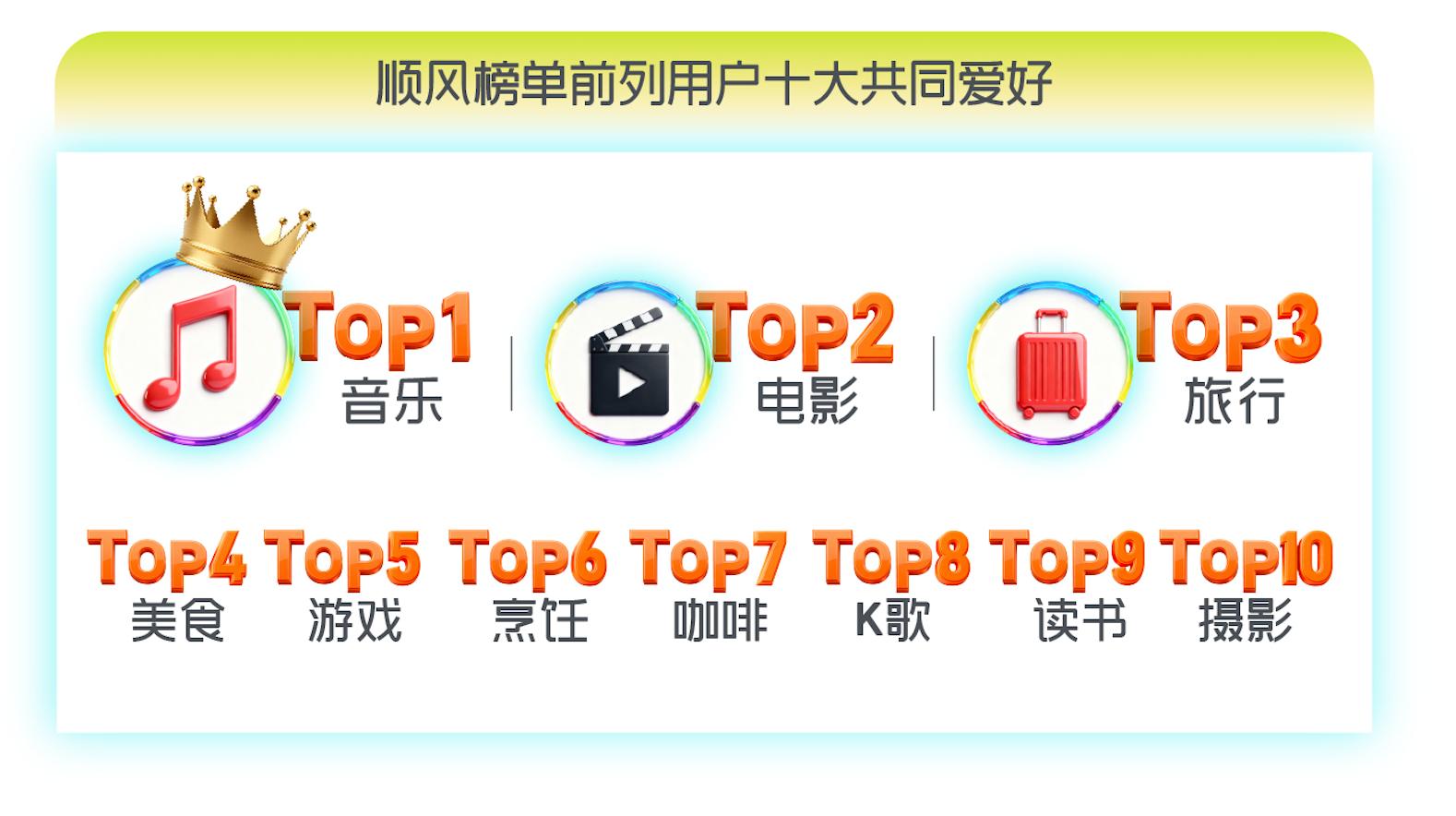 而在顺风榜单前列用户添加占比的“爱好”类标签中,前十大爱好依次为音乐、电影、旅行、美食、游戏、烹饪、咖啡、K歌、读书和摄影。