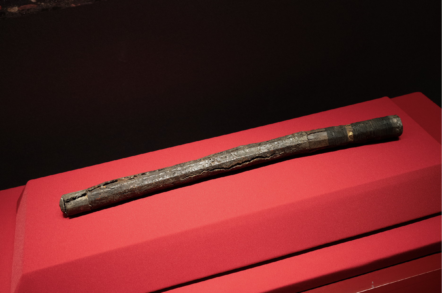 即便如此,刘建墓中的文物仍透着一股英武之气。这件错金银八棱棁非常独特,它无尖无刃,仅有八棱,为“棁”一类的兵器。顶端包银,柄端铁芯外嵌金箔一周,金箔两侧以绳缠绕,周身错菱形纹和涡纹,制作工艺高超,是汉代铜兵器中不可多得的珍品。