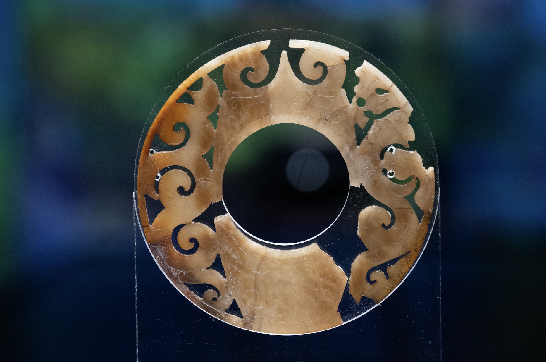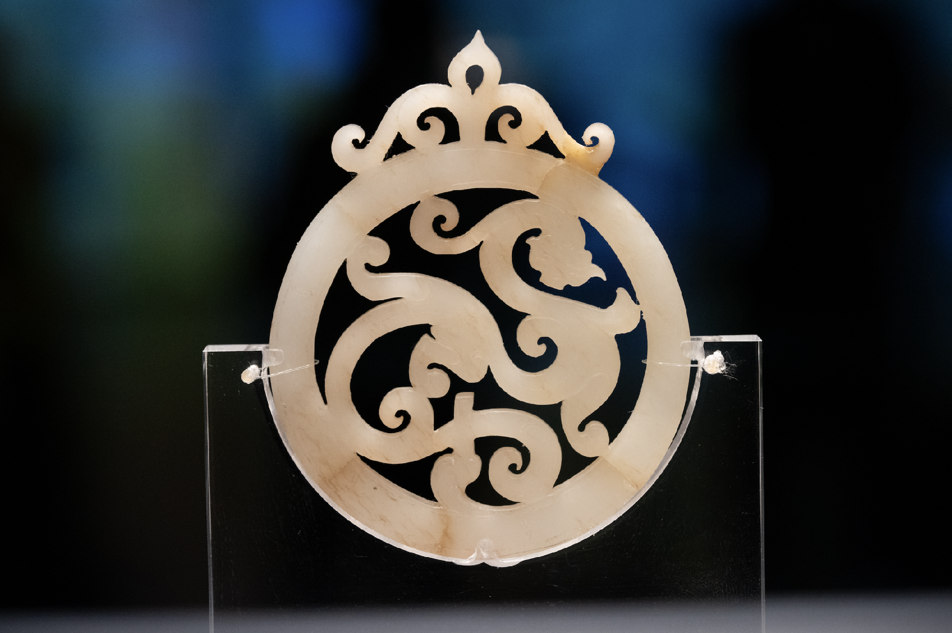 2号墓中还出土了一件透雕螭虎玉佩,玉佩上部镂雕成樱花状,中间镂雕一盘曲螭虎,虎体用阴刻线条刻出虎形,温润而灵动。