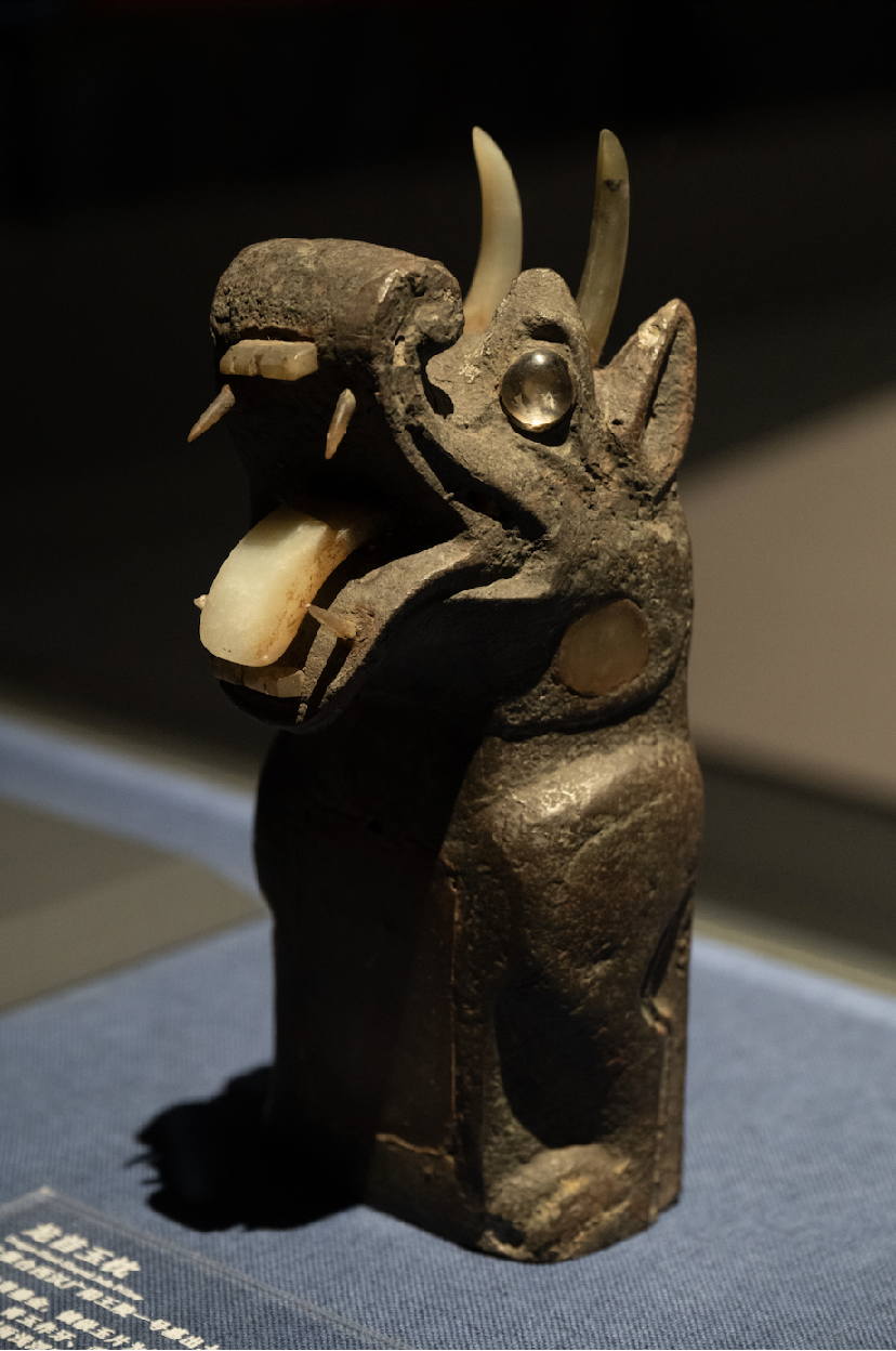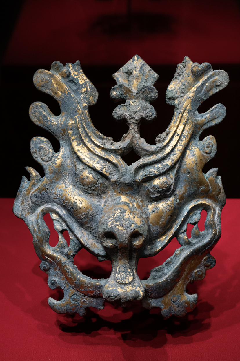 这件鎏金铜铺首的造型为龙首戴博山冠,冠饰神木灵草,双目圆睁、眉毛上扬、阔口獠牙。
