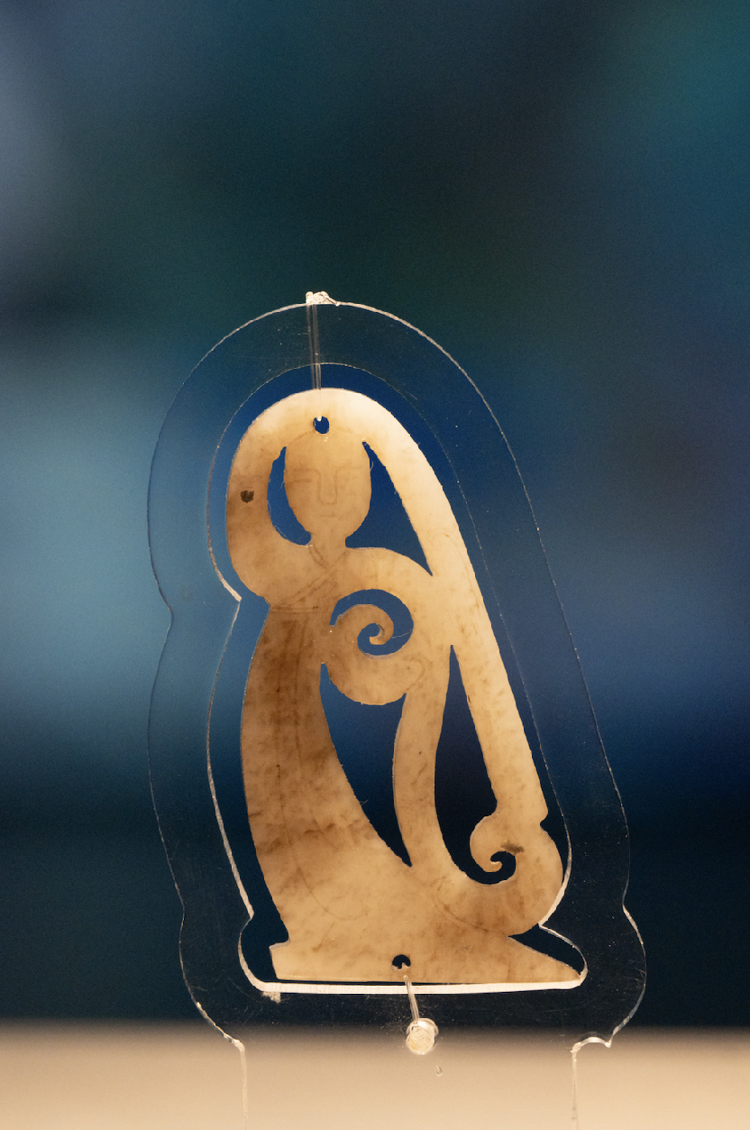 玉舞人长仅5.12厘米,头部与裙摆各有一孔,应属于“组玉佩”,可成套悬挂。眉眼鼻口仅以数道短阴线勾勒,尽显灵动飘逸之姿。方寸之间,广袖轻舒、腰肢婀娜,仿佛下一秒就会踏歌而起。