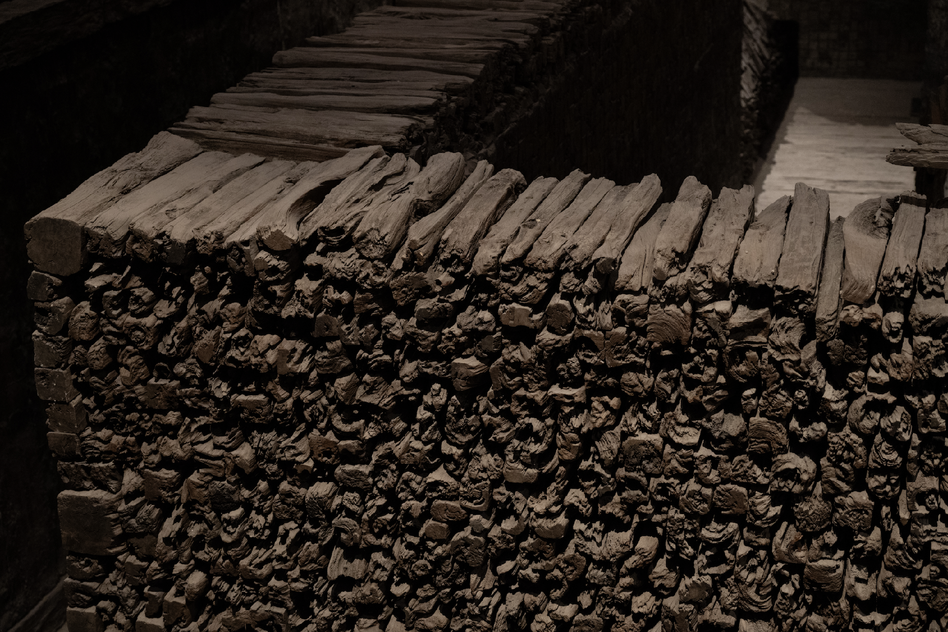 清除土堆,发掘墓室时,只见一根根长90厘米、宽厚各10厘米的条木层层垒起,堆成了墓室的四壁。条木平整划一,之间无榫卯固定。其中,三面倒塌严重,只有西面北段保存最好,堆垒严密齐整,木质犹新,呈棕褐色,至今闻之仍有芳香。据估算,全部墓室所用条木约1.5万块。