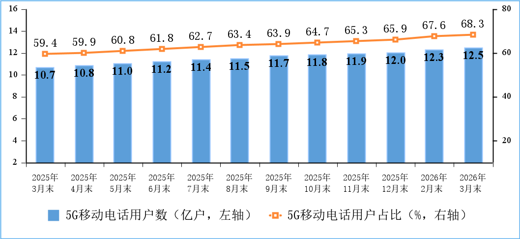 移动电话用户数稳中有增,5G用户规模持续扩大。截至3月末,三家基础电信企业及中国广电的移动电话用户总数达18.36亿户,比上年末净增920.1万户。其中,5G移动电话用户达12.54亿户,比上年末净增4953万户,占移动电话用户的68.3%。