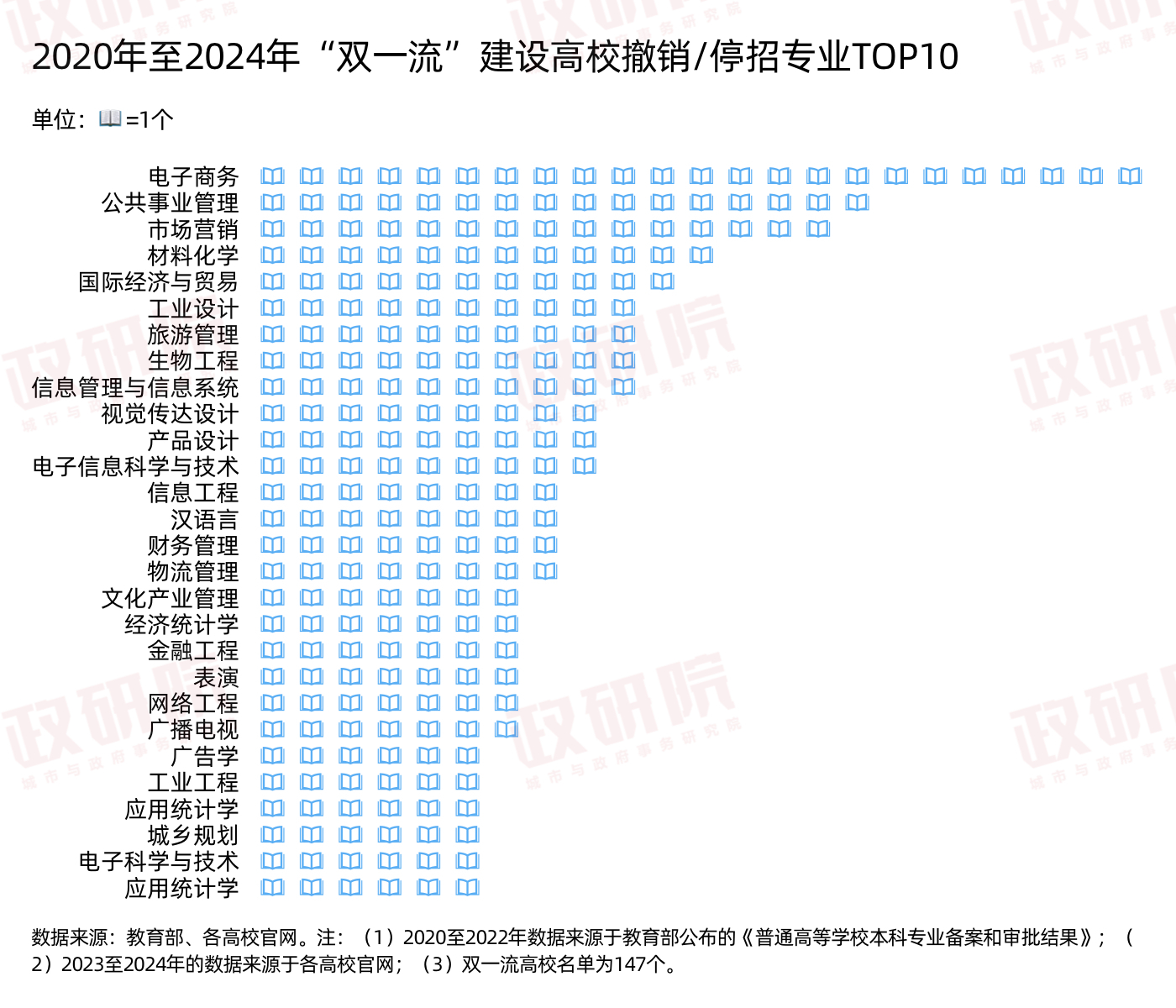 具体到专业,电子商务是近5年“双一流”建设高校中撤销或停招最多的专业,且力度逐年加大。仅2024年一年,就有包括西北工业大学、四川大学在内的9所“双一流”建设高校停招该专业。