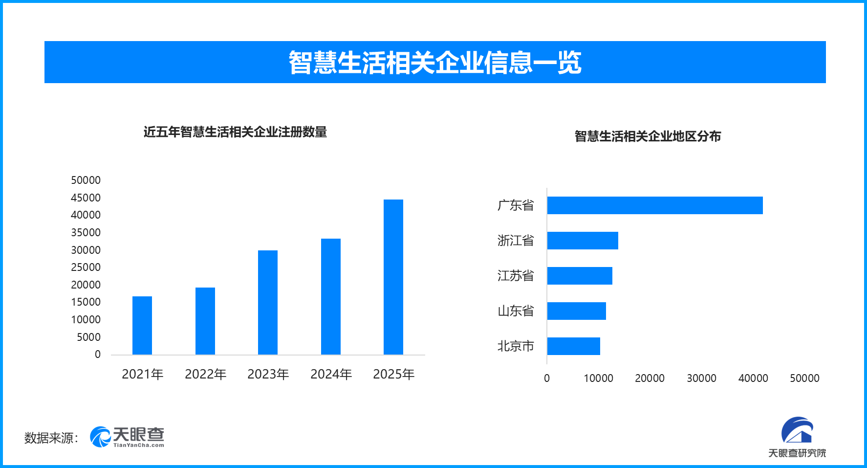 天眼查数据显示,我国现存智慧生活相关企业超 20.3 万家,2026 年至今新增约 1.2 万家,近五年注册量逐年增长,2025 年达峰值;广东以超 4.1 万家企业居全国首位,浙江、江苏等紧随其后。