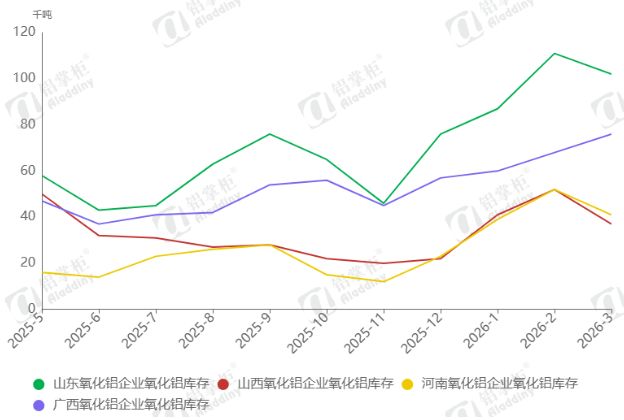 从库存数据对比来看,晋豫两地氧化铝库存持续处于低位,且显著低于沿海的山东、广西地区。阿拉丁(ALD)统计数据显示,近期电解铝厂内、氧化铝厂内氧化铝库存均呈现去库态势,但区域分化明显。晋豫两地氧化铝厂内成品库存长期维持低位,截至2026年3月31日,全国氧化铝厂内成品库存仅205.5万吨,其中晋豫两地库存为78万吨,全国占比不足38%。反观山东地区,作为沿海氧化铝主产区,氧化铝库存压力显著较大,截至2026年3月,其氧化铝厂库存就达102万吨,较晋豫两地总和高出24万吨,且山东沿海青岛港、日照港也有一定的氧化铝库存仍在持续累库,库存消化压力突出。这种差异长期存在,并非短期市场波动所致,恰好是晋豫氧化铝产能核心优势的直接体现。