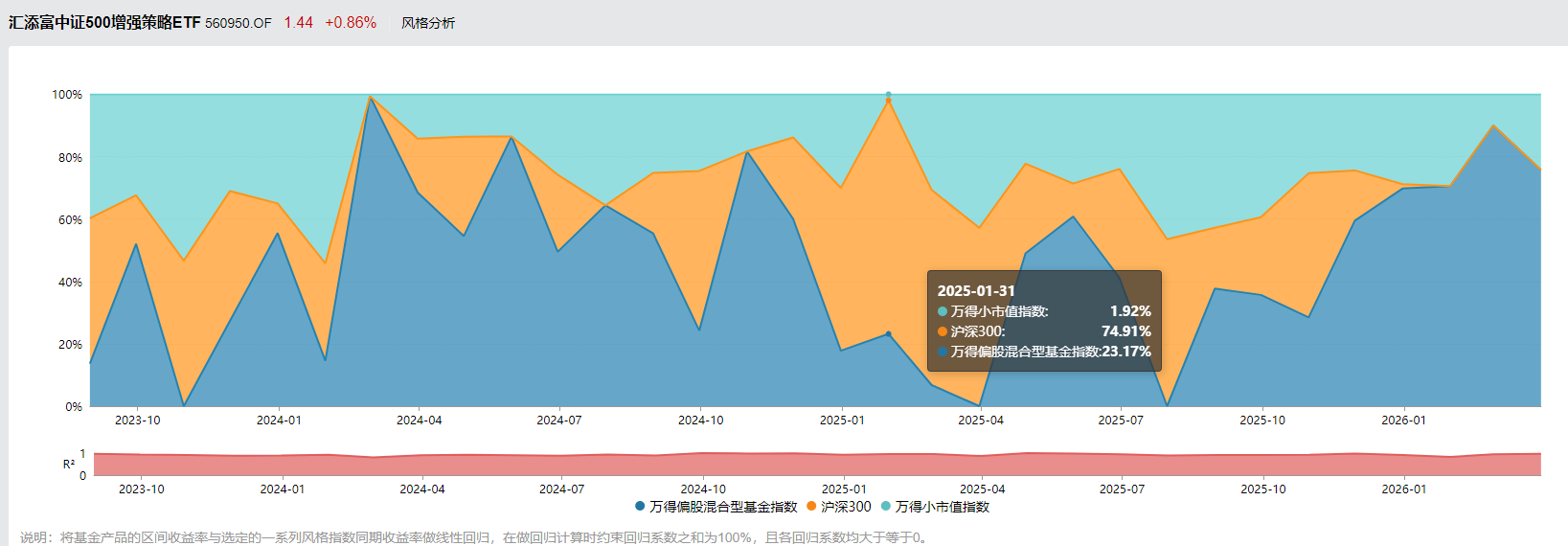 此外,记者查阅Wind数据发现,汇添富中证500增强策略ETF(交易型开放式指数基金)在2024年年底至2025年10月底,对沪深300的持仓出现阶段性超配。其中,2025年1月31日,该基金配置沪深300的系数比例高达74.91%。